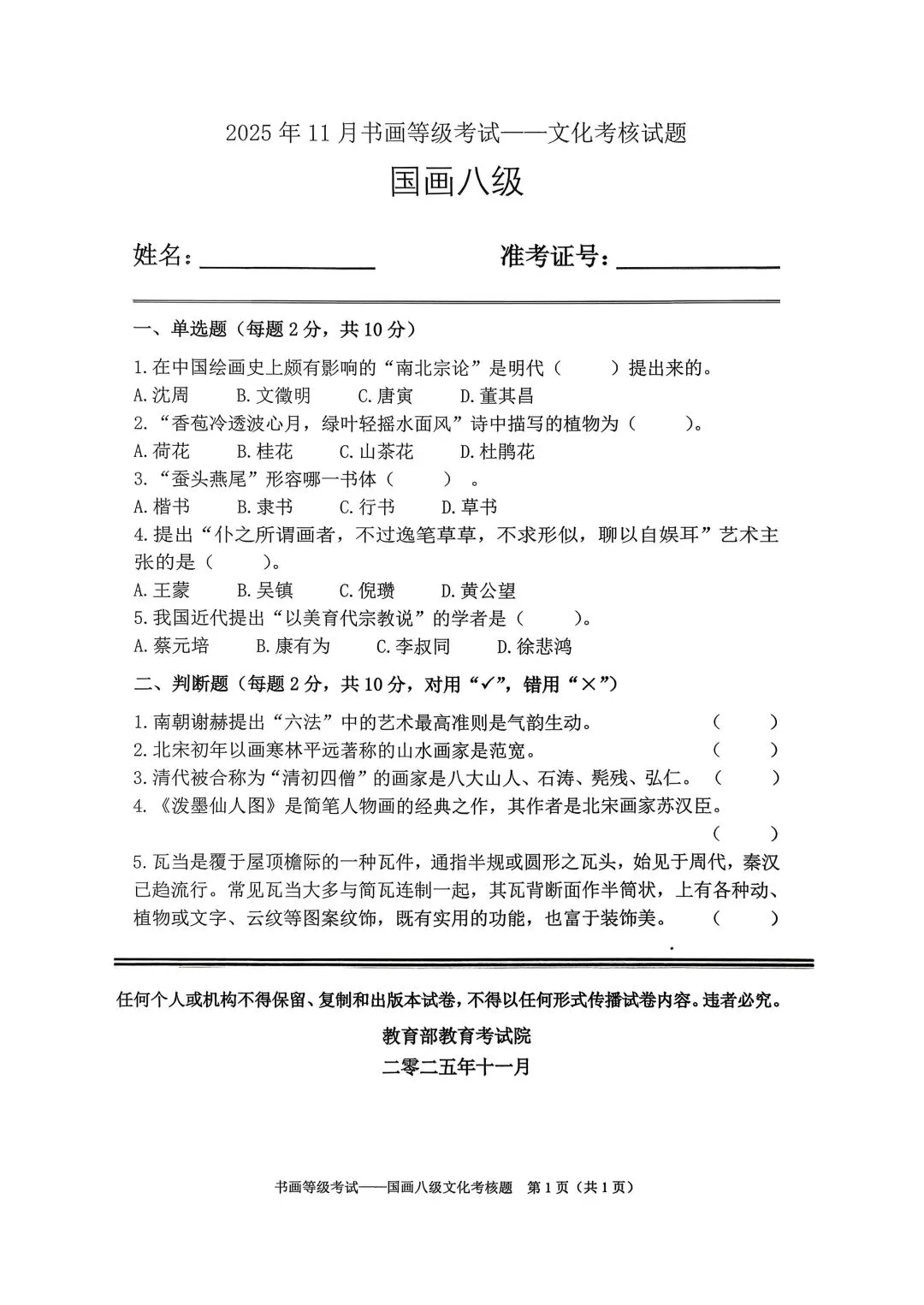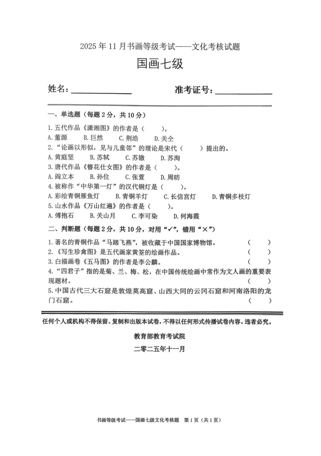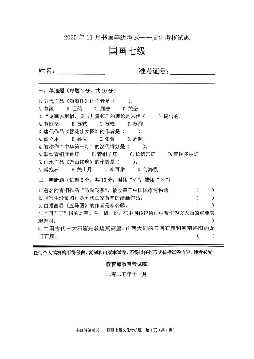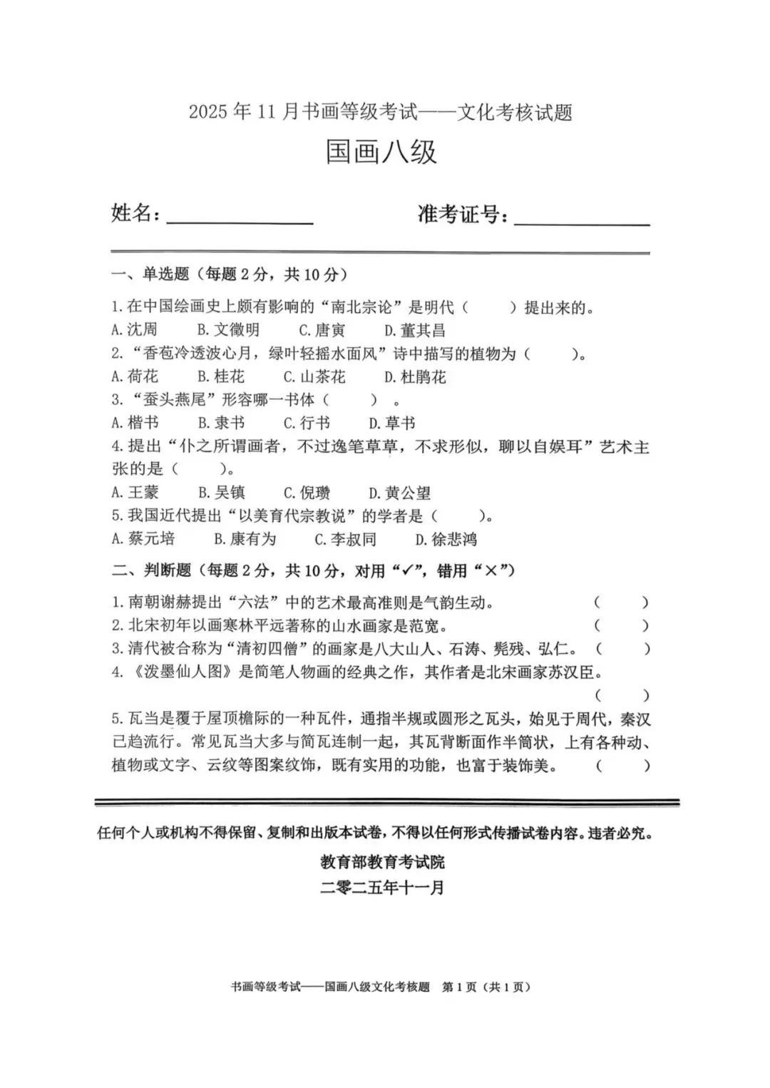 教育部书画等级考试2025年11月真题试卷(美术类)