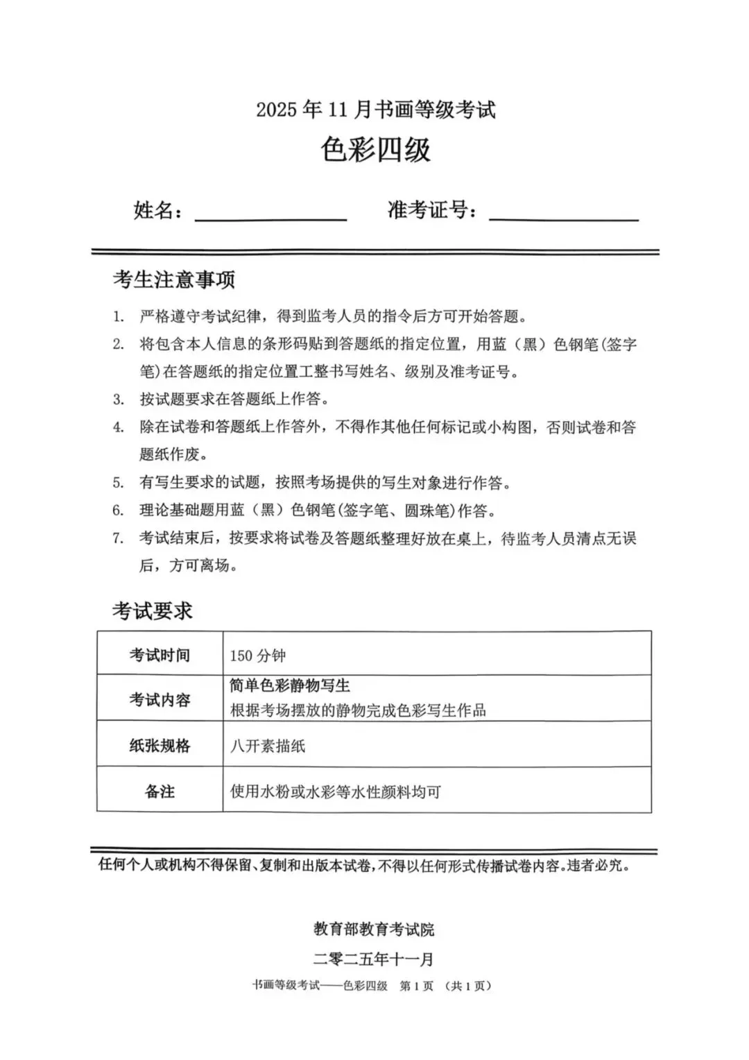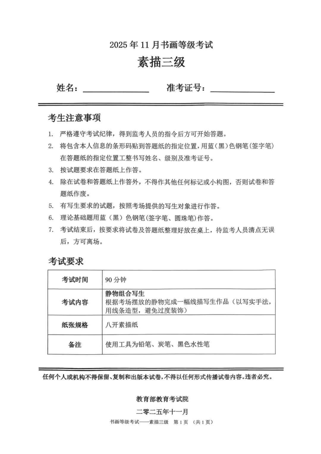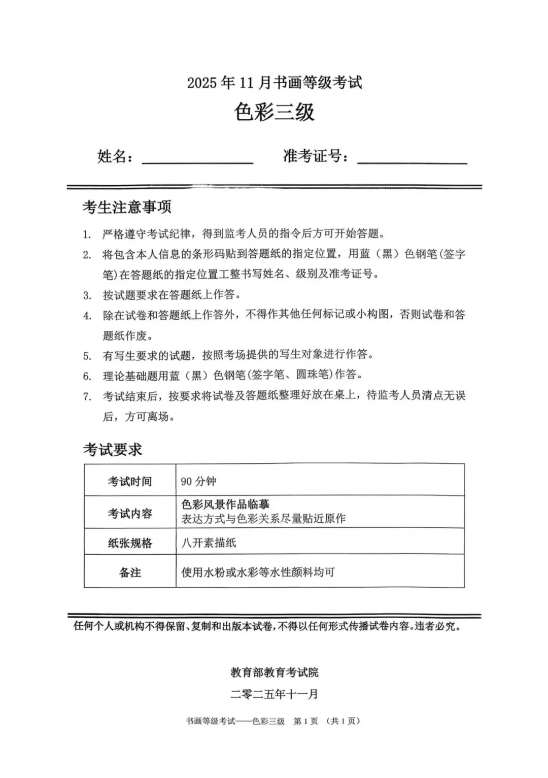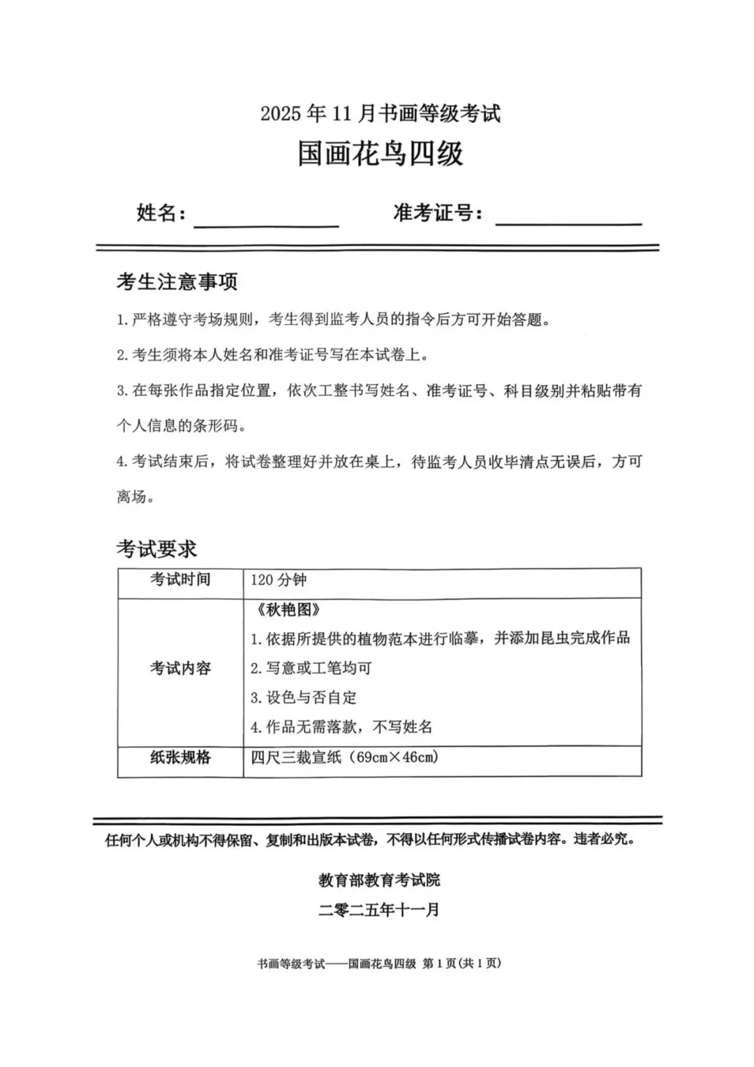 教育部书画等级考试2025年11月真题试卷(美术类)