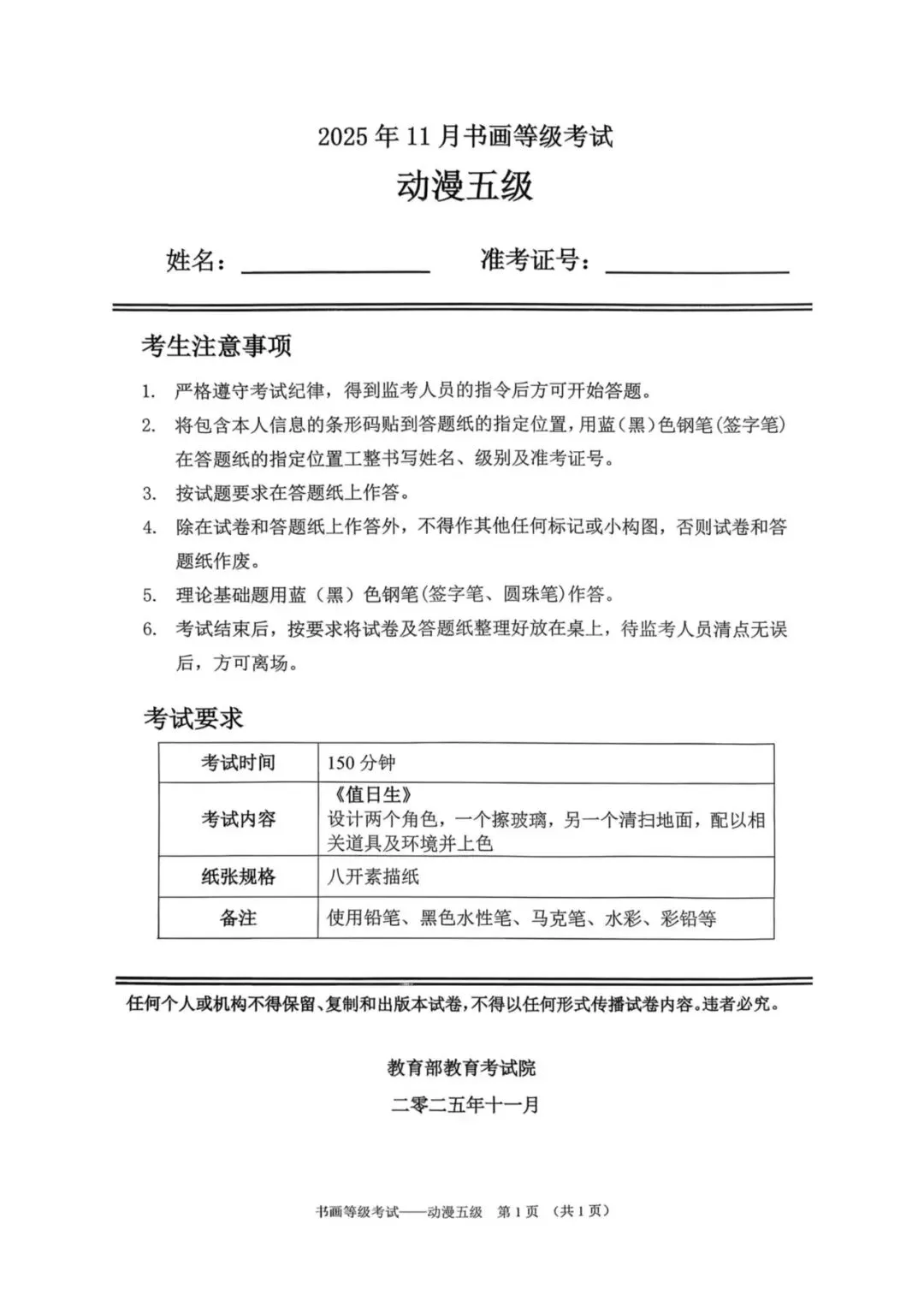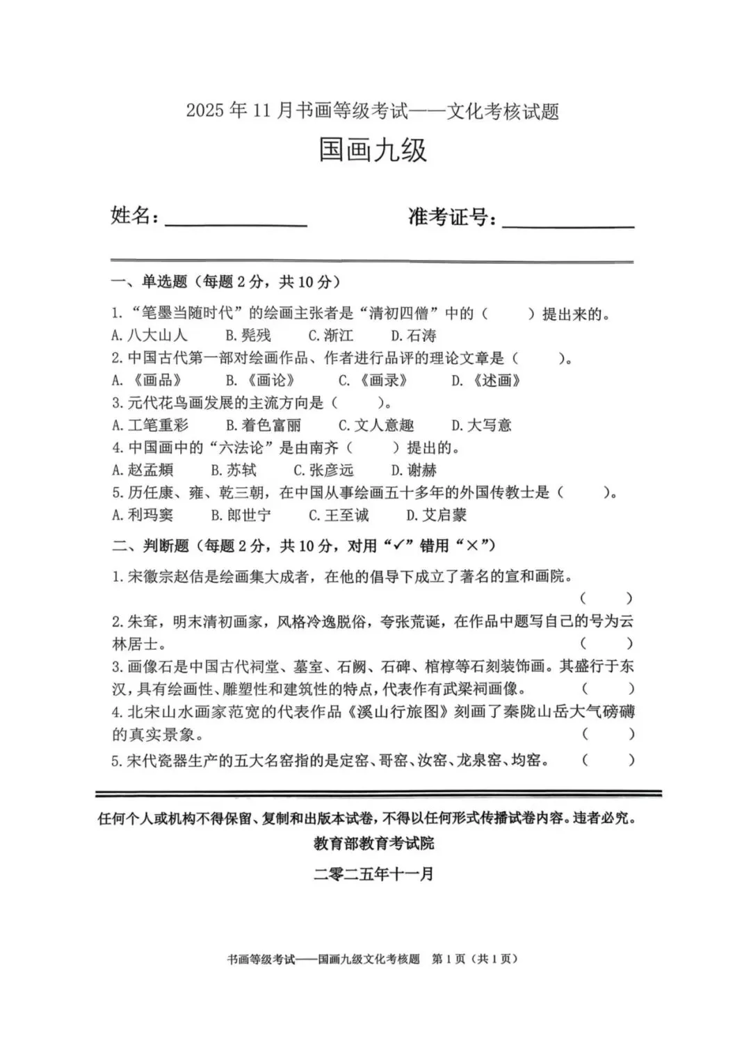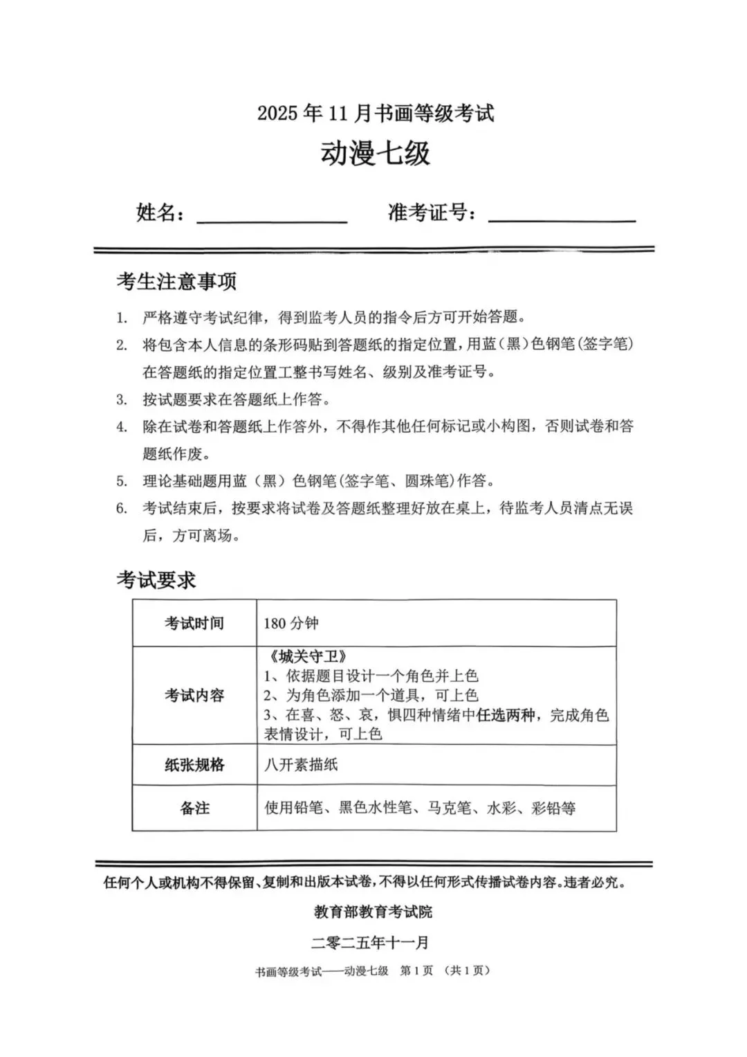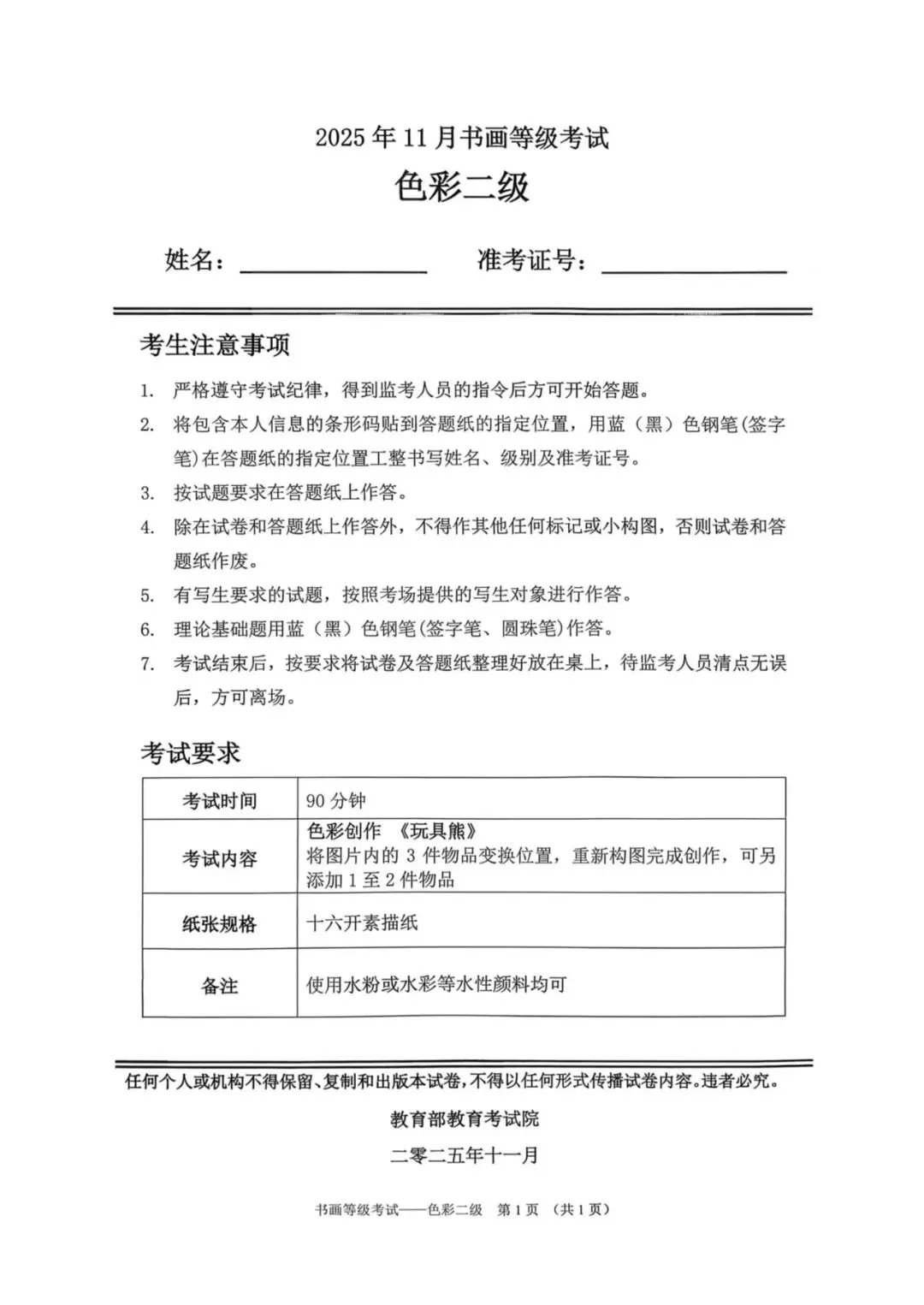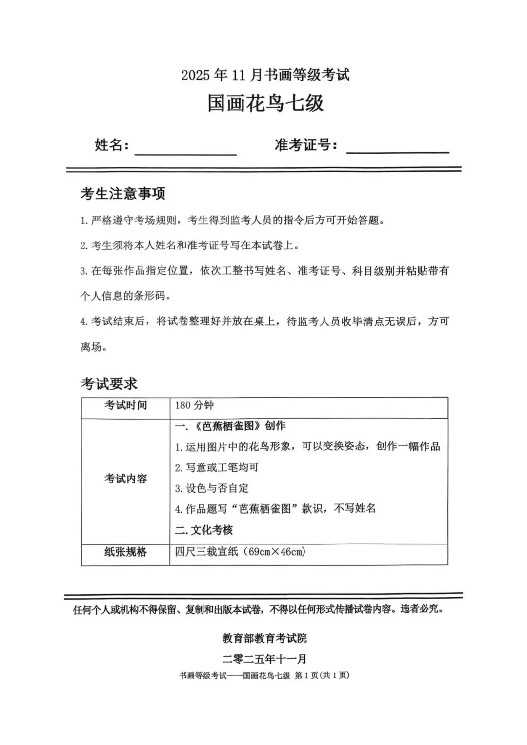 教育部书画等级考试2025年11月真题试卷(美术类)