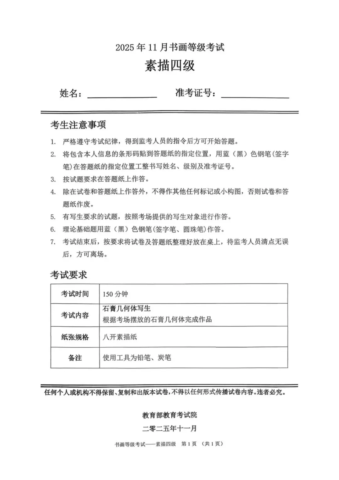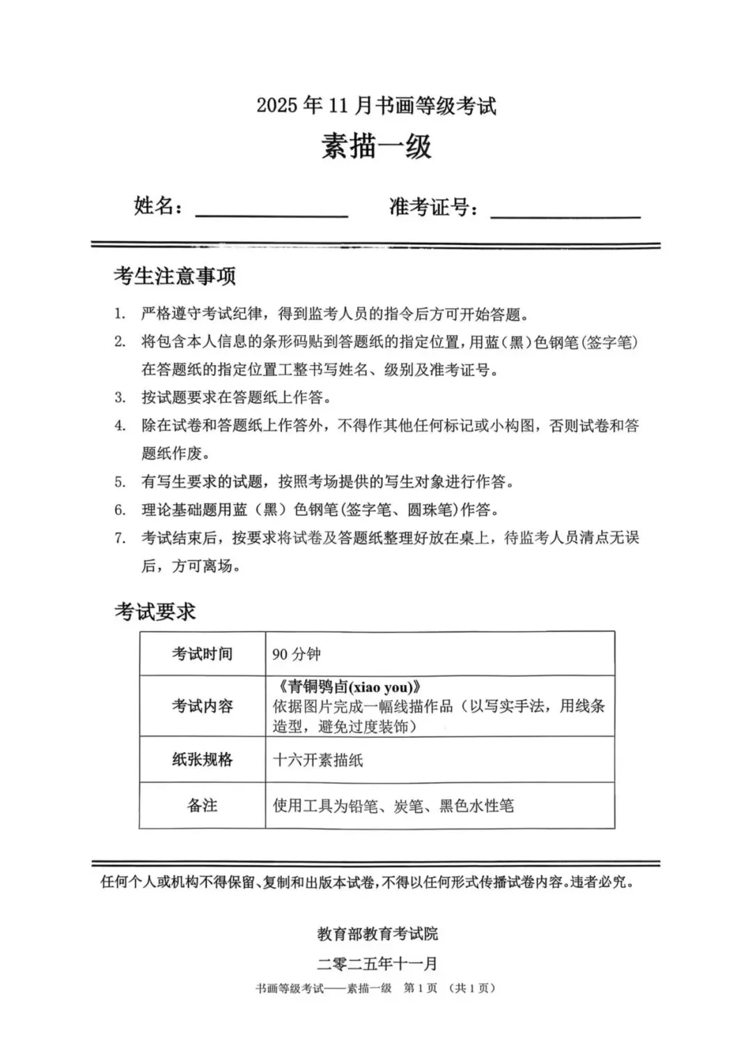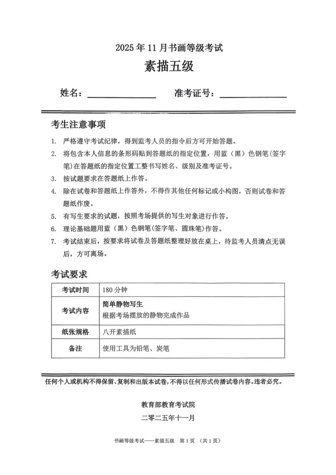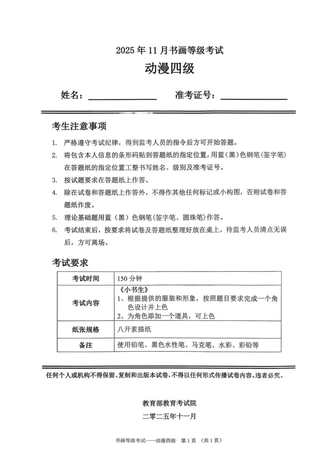 教育部书画等级考试2025年11月真题试卷(美术类)