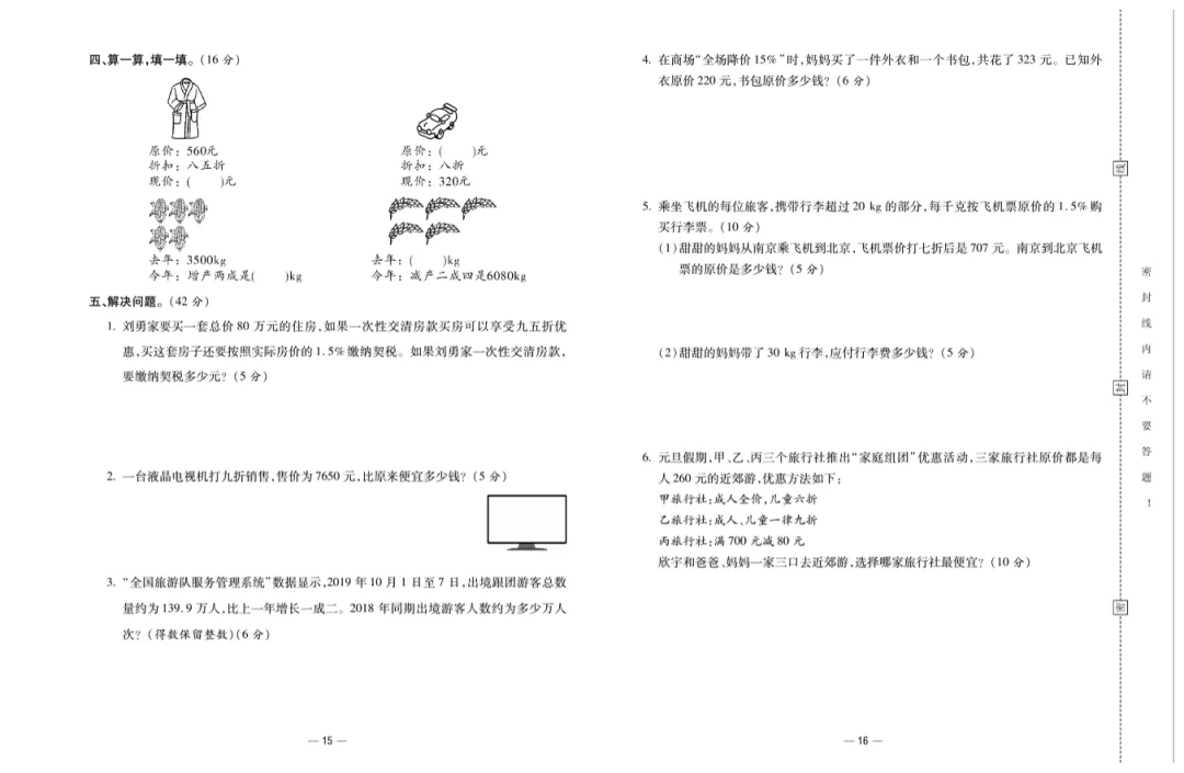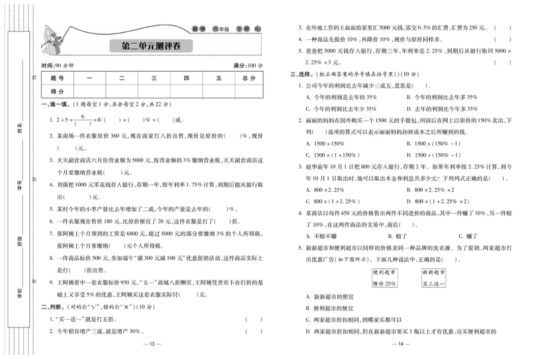 【免费下载】六年级(下)数学 第二单元测试卷《人教版》,PDF电子版,共3页,可打印
