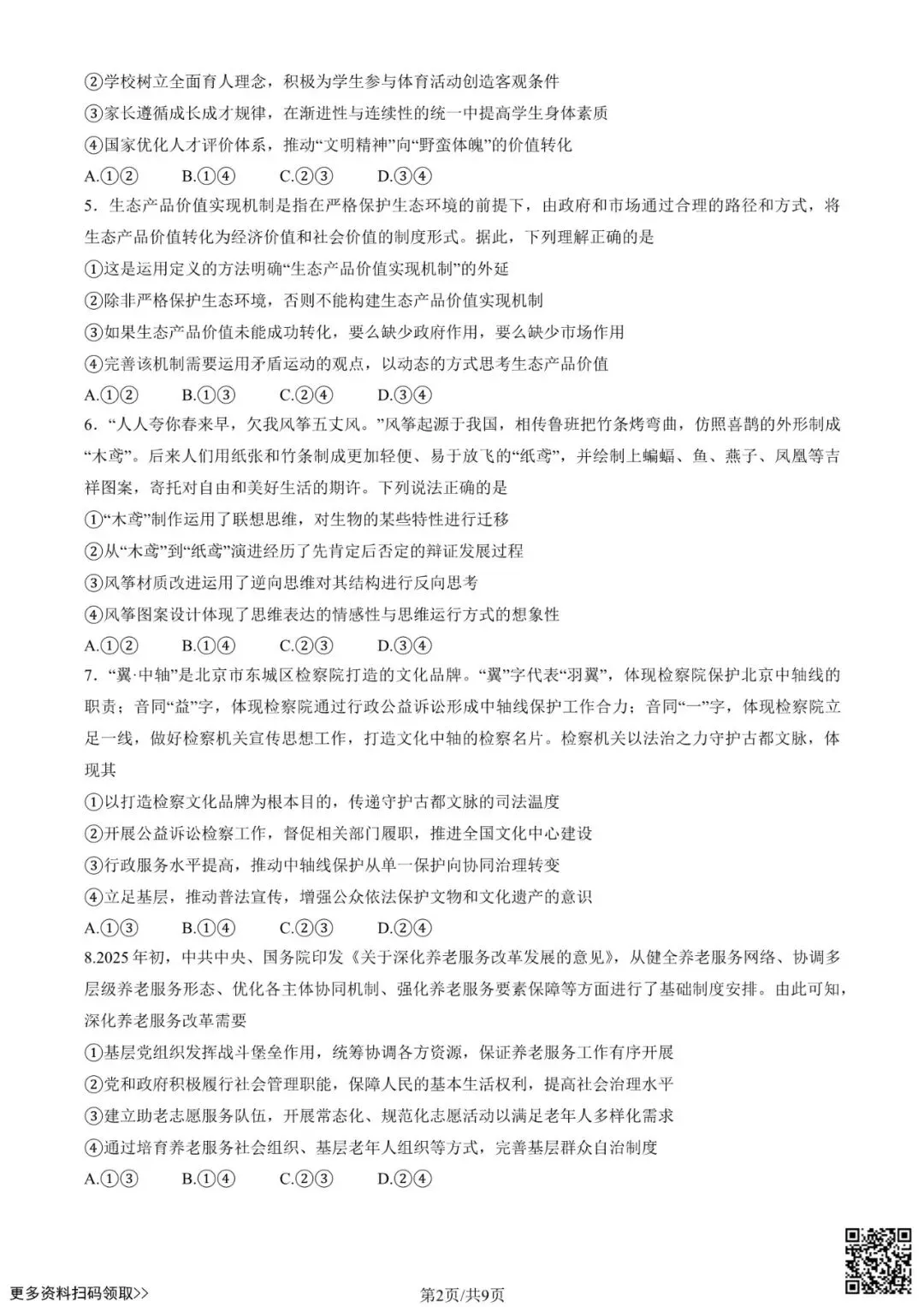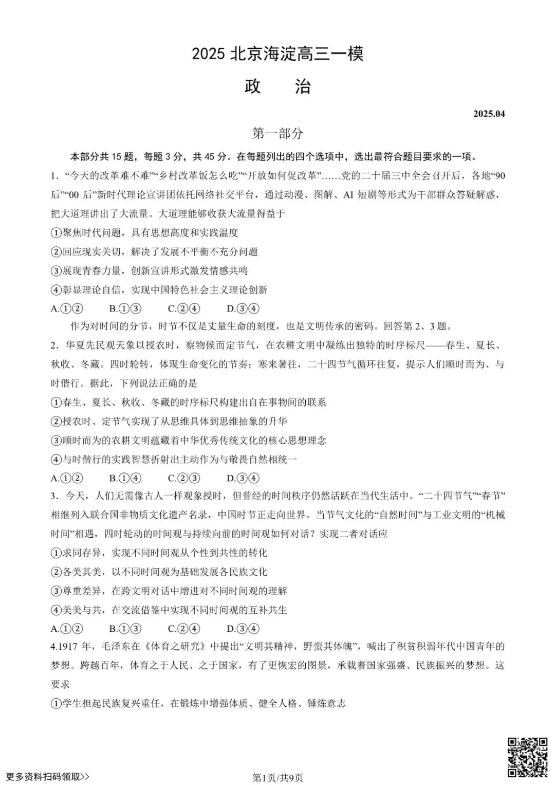 今天给大家分享的是2025北京海淀高三一模政治试卷(含答案),其他区域或学校的学生都可以练一练。近期会持续分享,欢迎大家多多关注,也可以把我们分享给更多人哦。