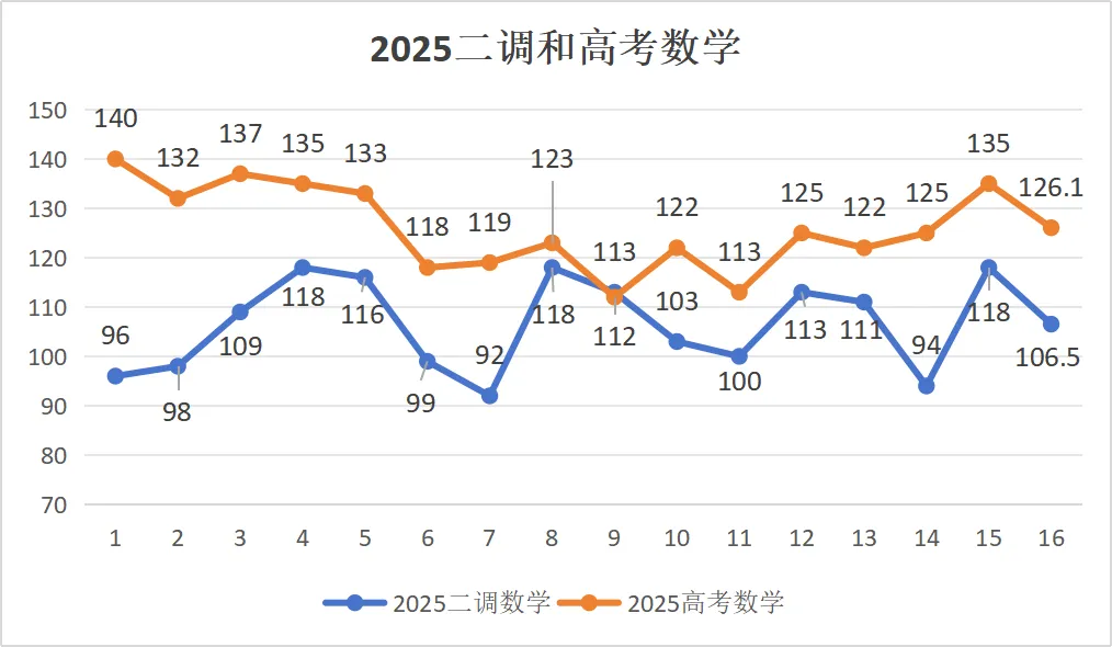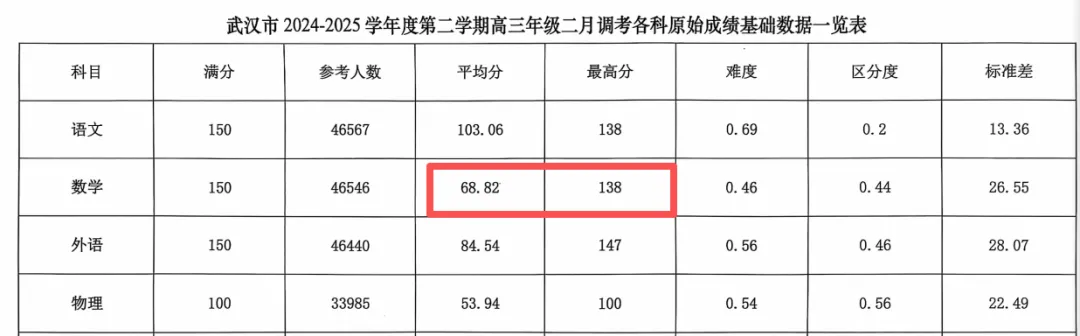 作者:三千字五色春:提供升学干货,QQ群231935352------------------------------------------------------------------------------------------------------------------------2026年,2月份因春节等原因,没有举行调考,武汉三月调考安排如下:19题为圆锥曲线,11题多选为新定义,和八省联考数学试卷结构一致2025武汉二调数学:最高分138分,平均分68.81)19题不是新定义(创新)题2)11题多选为新定义题目3)选填题目难度正常4)大题为导数+立体几何+三角+概率+圆锥二:2025年和2024年的二调数学的十分段情况