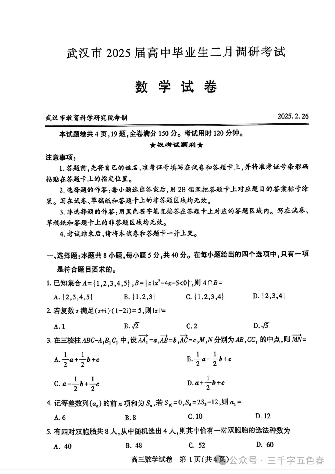 【武汉三调】2026武汉三调调数学试卷出炉,和2025武汉二调数学结构一致,附2025年数学分数分析