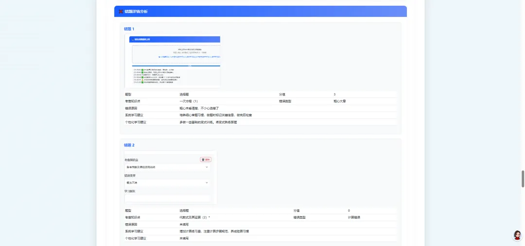 结合之前在作业帮等公司的经历,试卷分析的主要目的是针对学生没掌握的题,分析错误原因和提供解决规划方案,同时实现可视化产出用于服务落地。因此它的功能就必须有数据分析、题型分析、建议和文档或图片等功能。