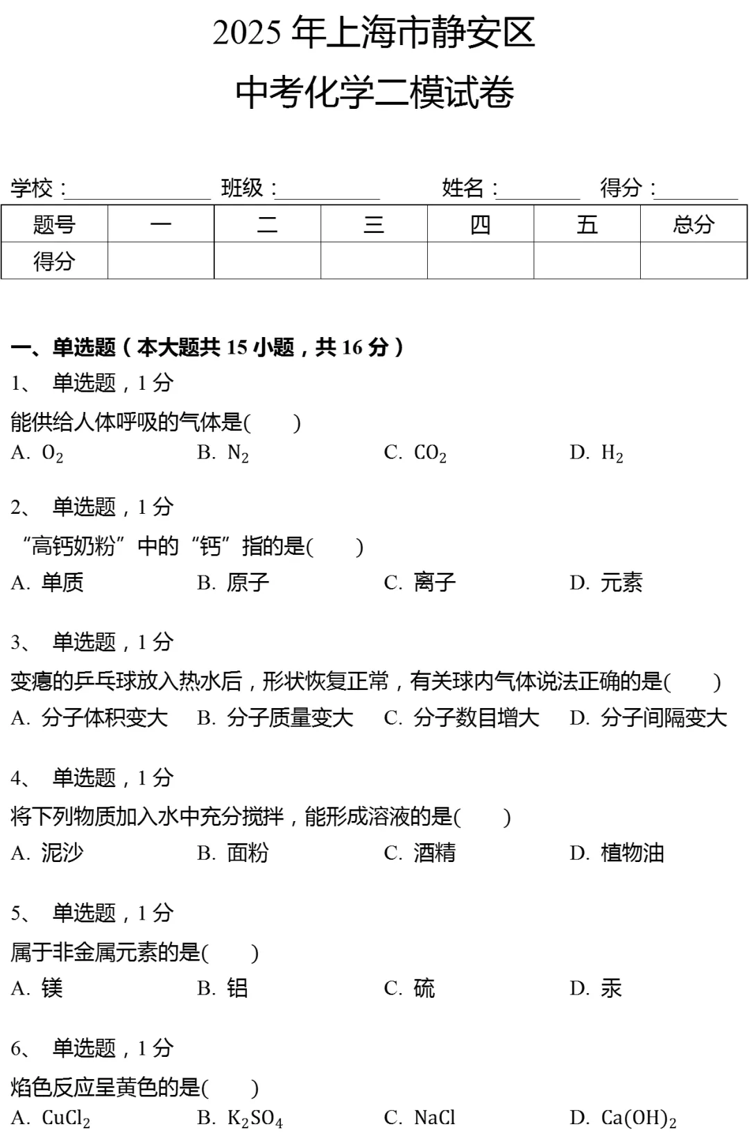 【初三二模】2025届上海各区初三二模试卷+答案!可下载电子版!