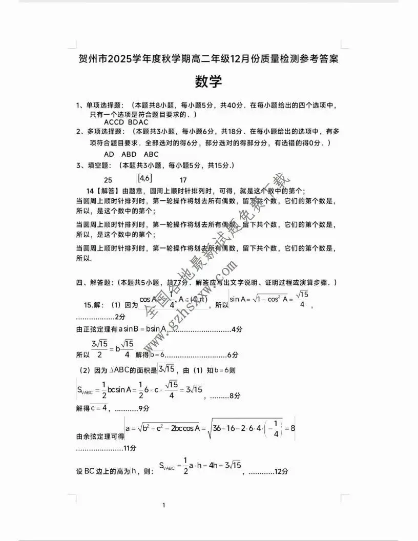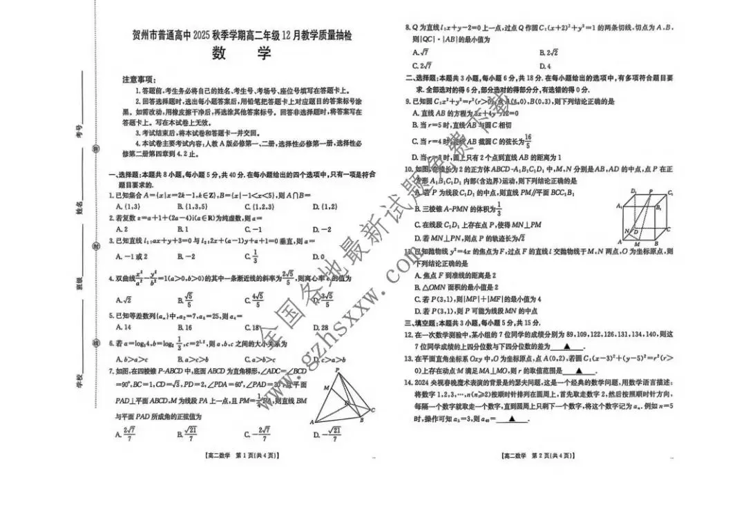 《高中试卷》2026广西贺州市普通高中高二上学期12月教学质量抽检(可免费下载)-数学