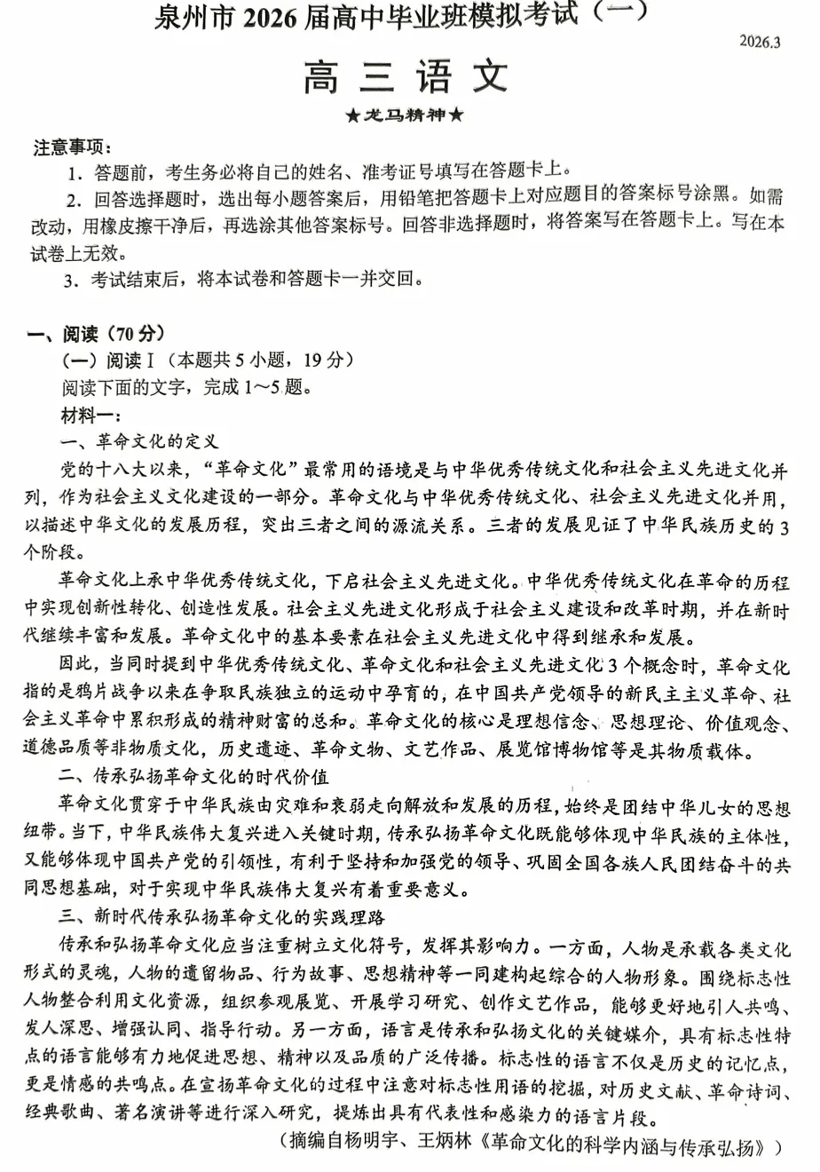 2026届高三泉州三检今日开考