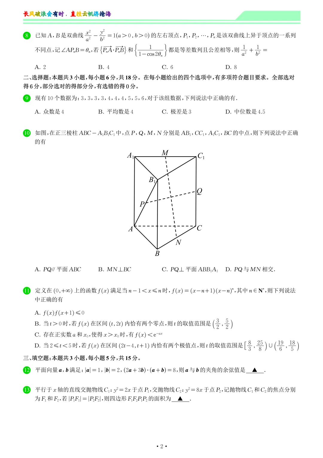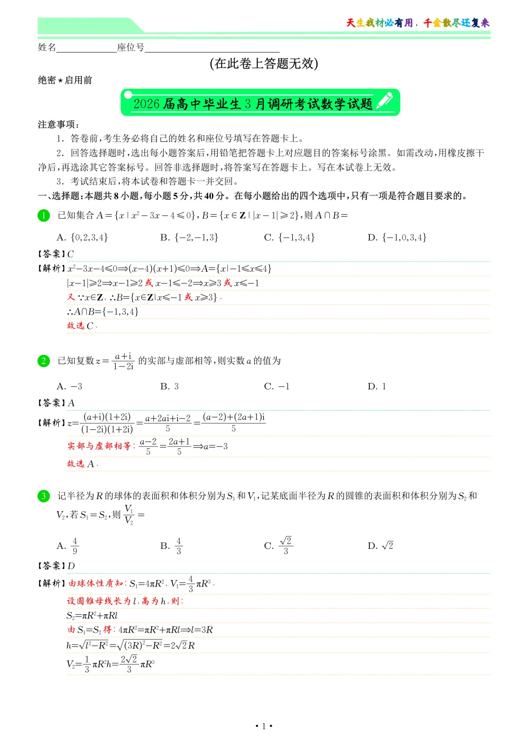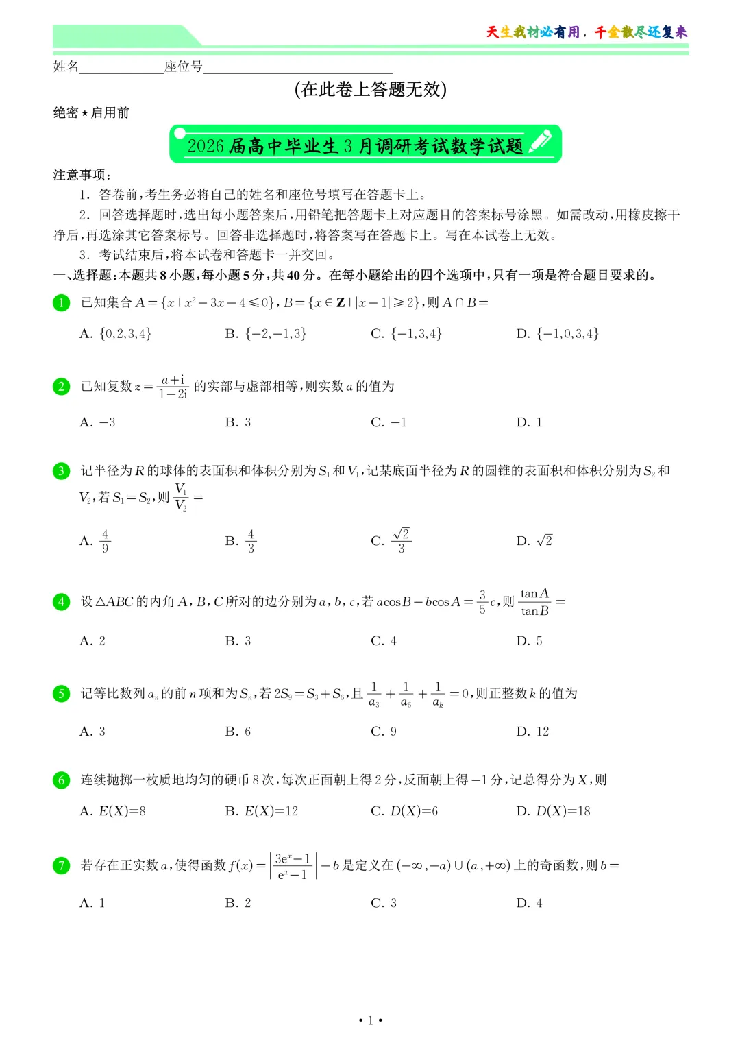 2026届高中毕业生3月调研考试数学试卷和答案