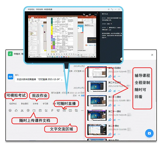 通过线上钉钉/腾讯会议等平台授课,一对一进行辅导,打卡、答疑、上传讲义、可视频、语音、白板、播放PPT等功能,一应俱全,使用方便。