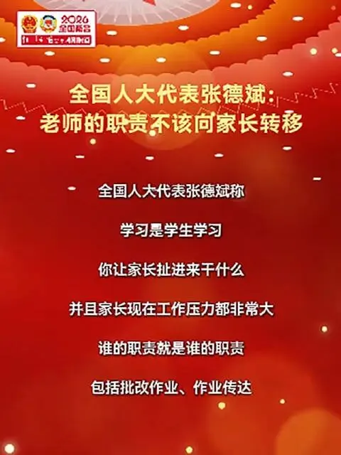 批改作业、打印试卷、监督打卡、拍视频上传、做手抄报、轮流护学岗……今年全国两会上,全国人大代表张德斌的一段发言引发大量共鸣:这句话看似简单,却点中了很多家庭这些年的真实困扰。