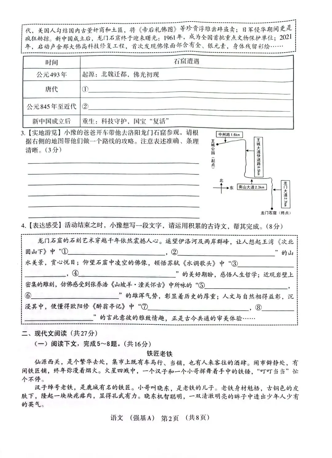 基础板块:聚焦龙门石窟相关的字音、字形、病句、古诗文默写,基础考点扎实,还融入表格填空、文案撰写等实用题型,兼顾基础与应用。