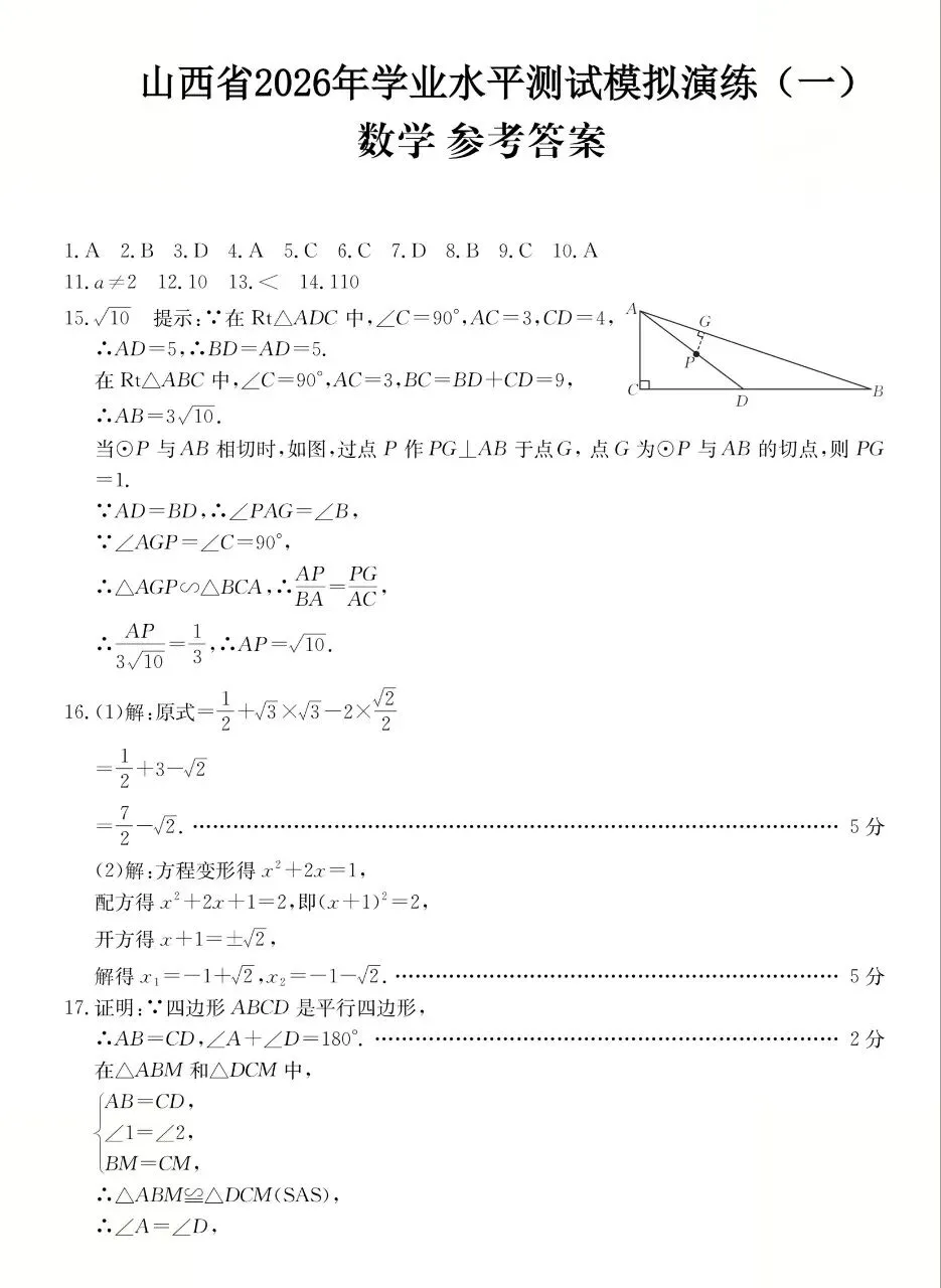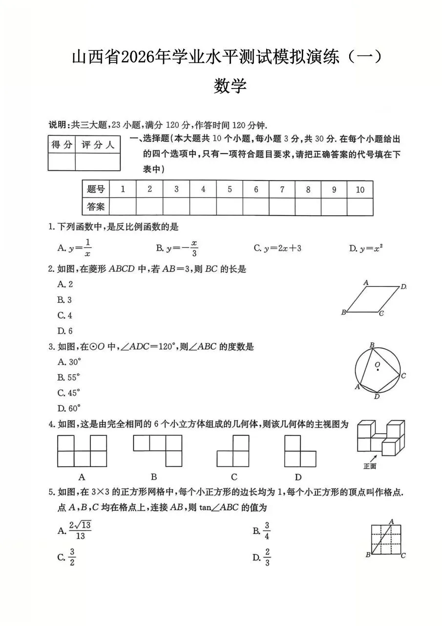 >山西省2026年学业水平测试模拟一数学试卷+答案