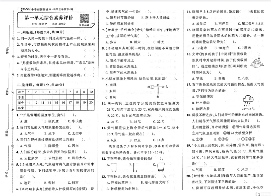 >【可下载】2026年春新教科版科学三年级下册第一单元综合素养