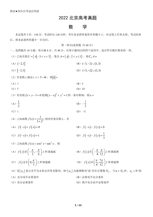 2022北京高考数学真题数学(有答案)【可下载】
