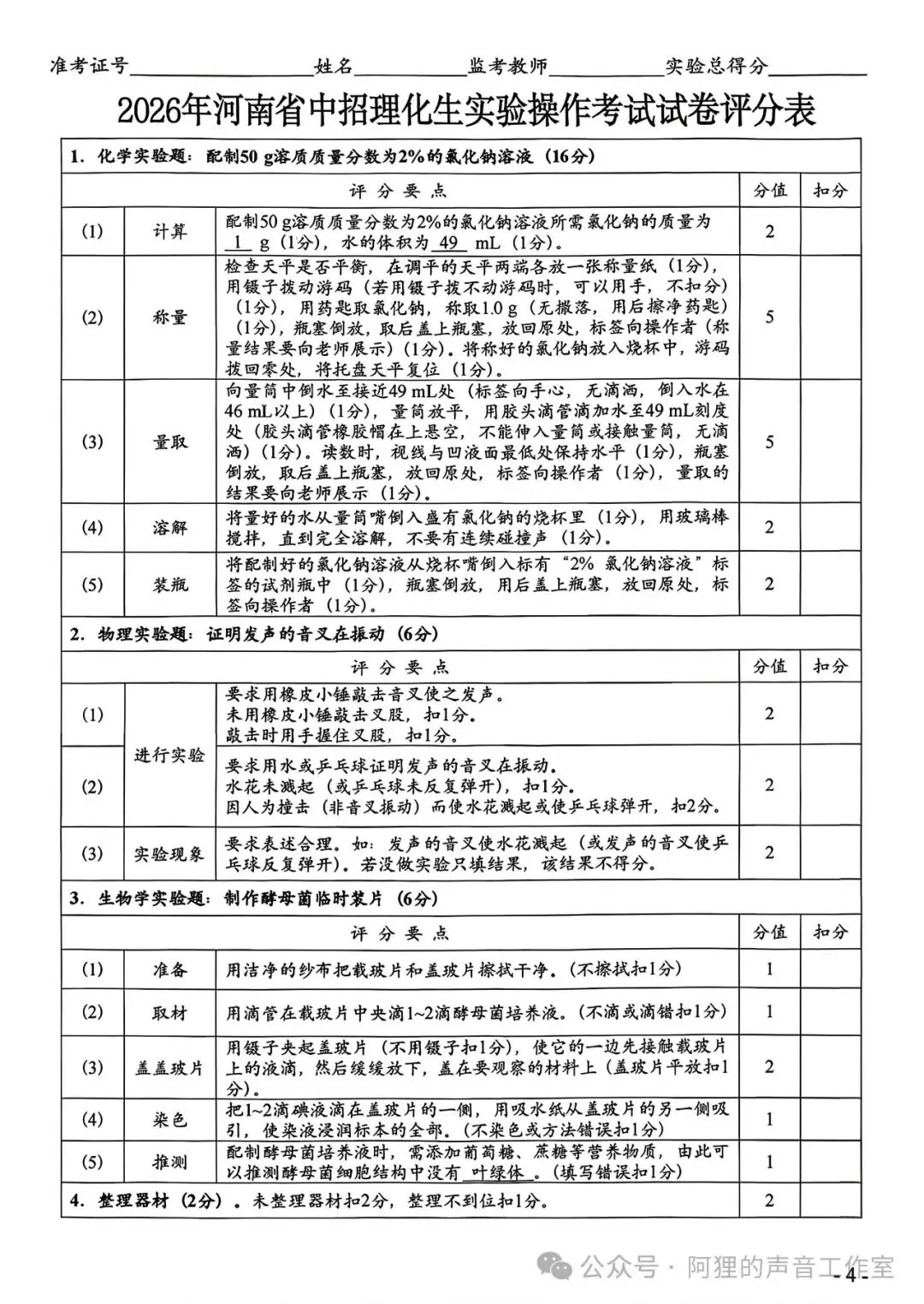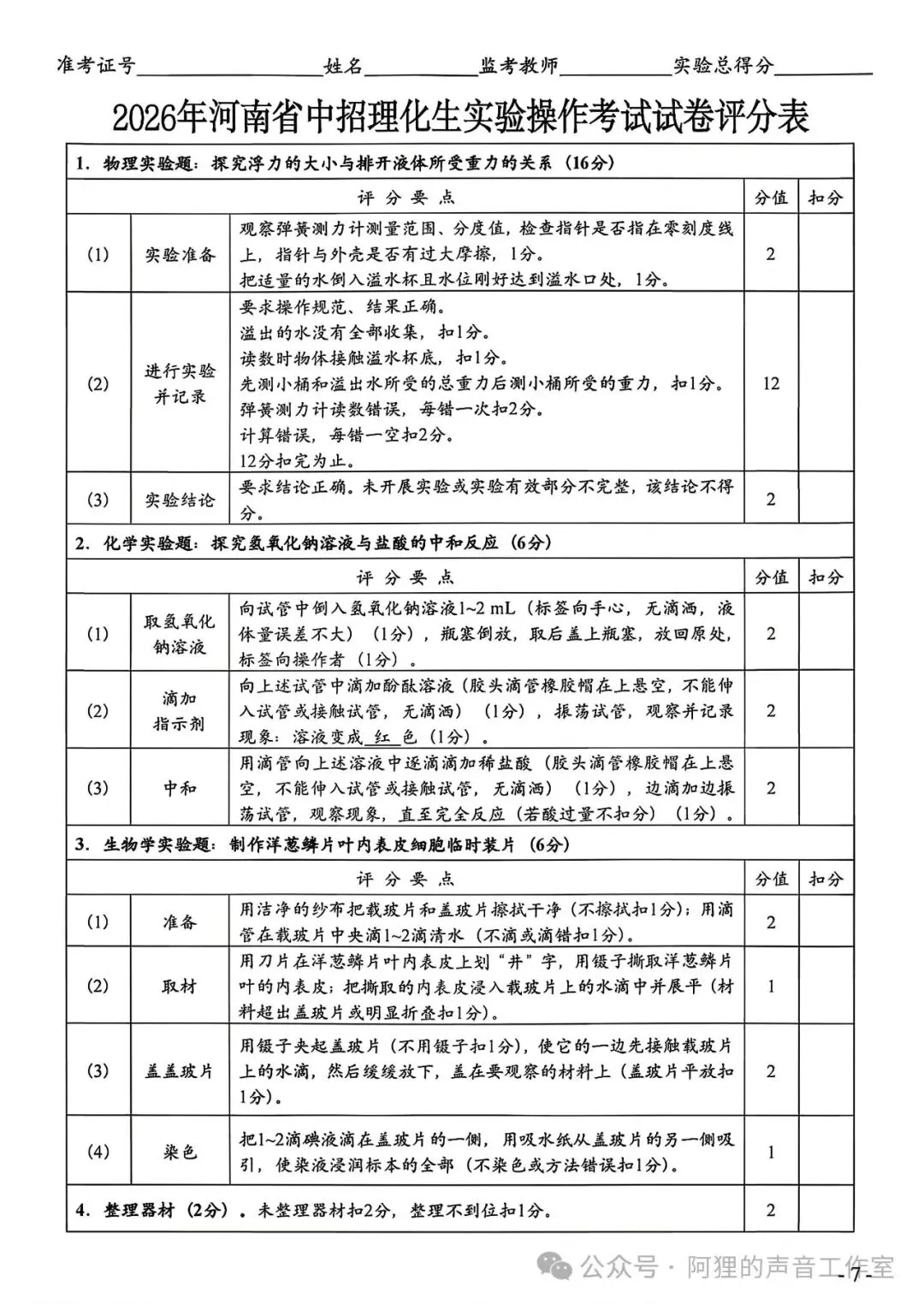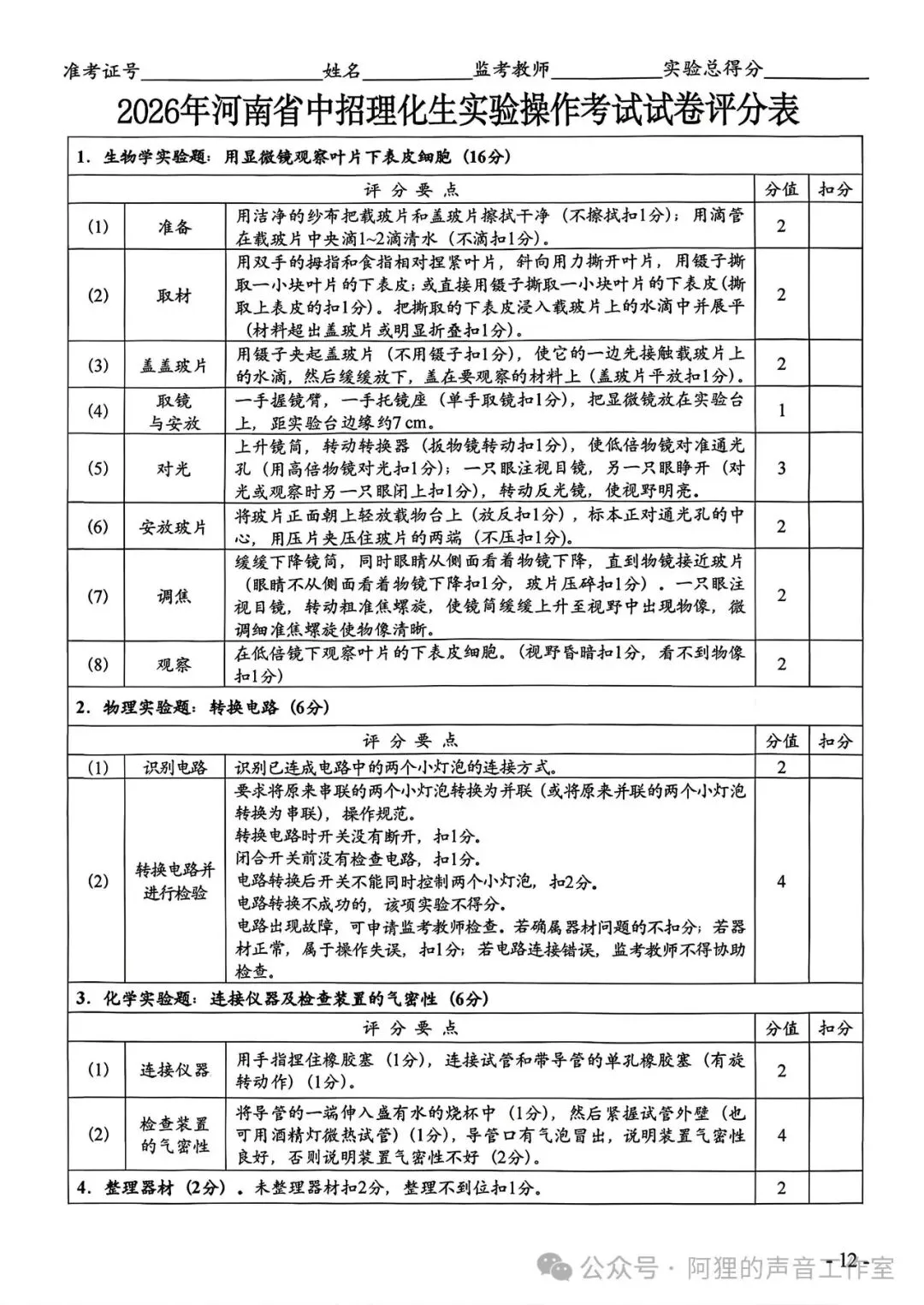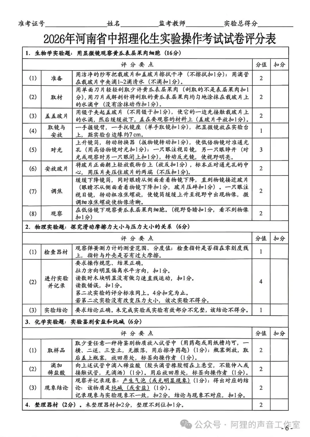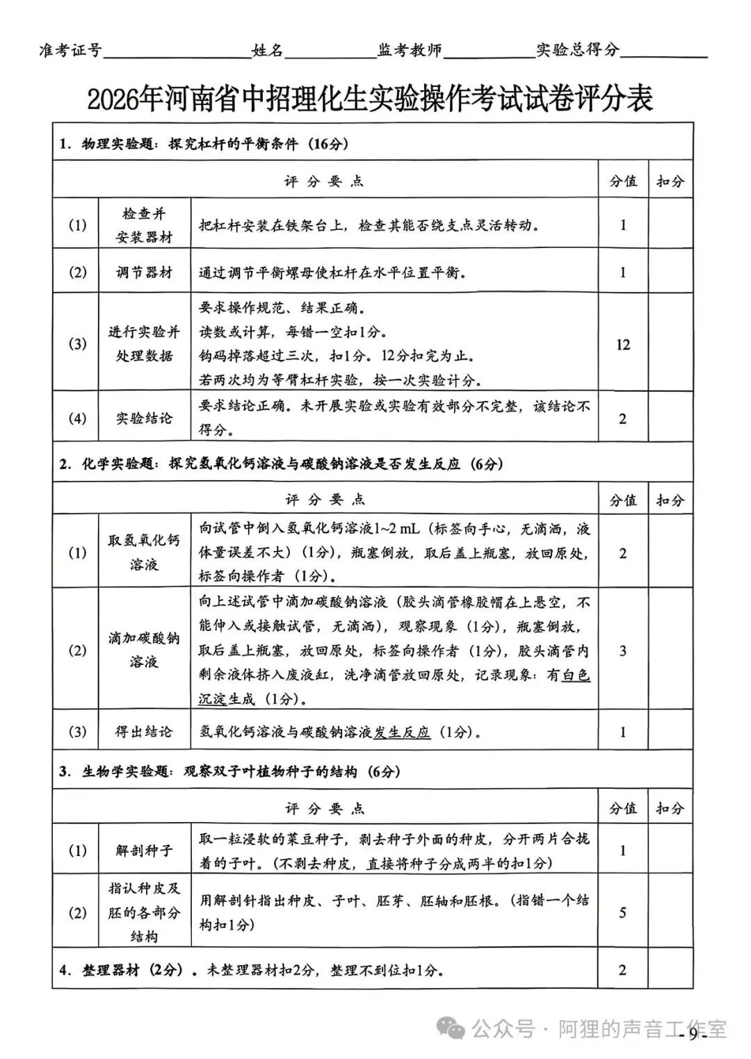 >2026年河南省中招理化生实验操作考试试卷评分表