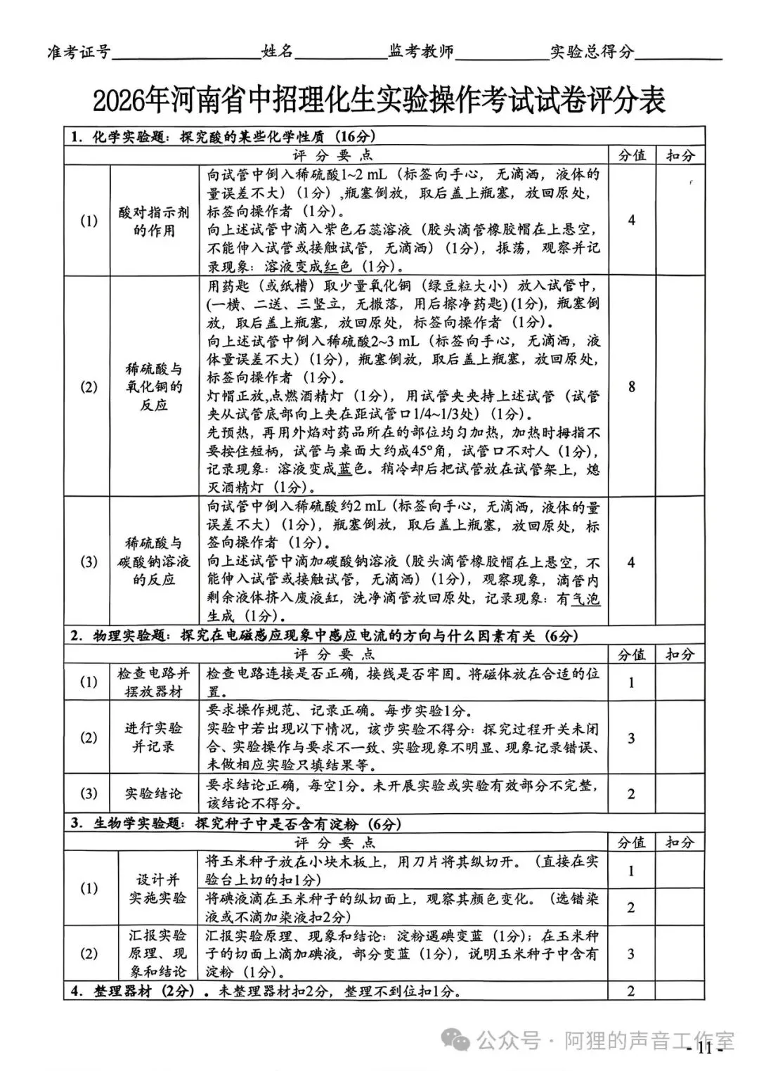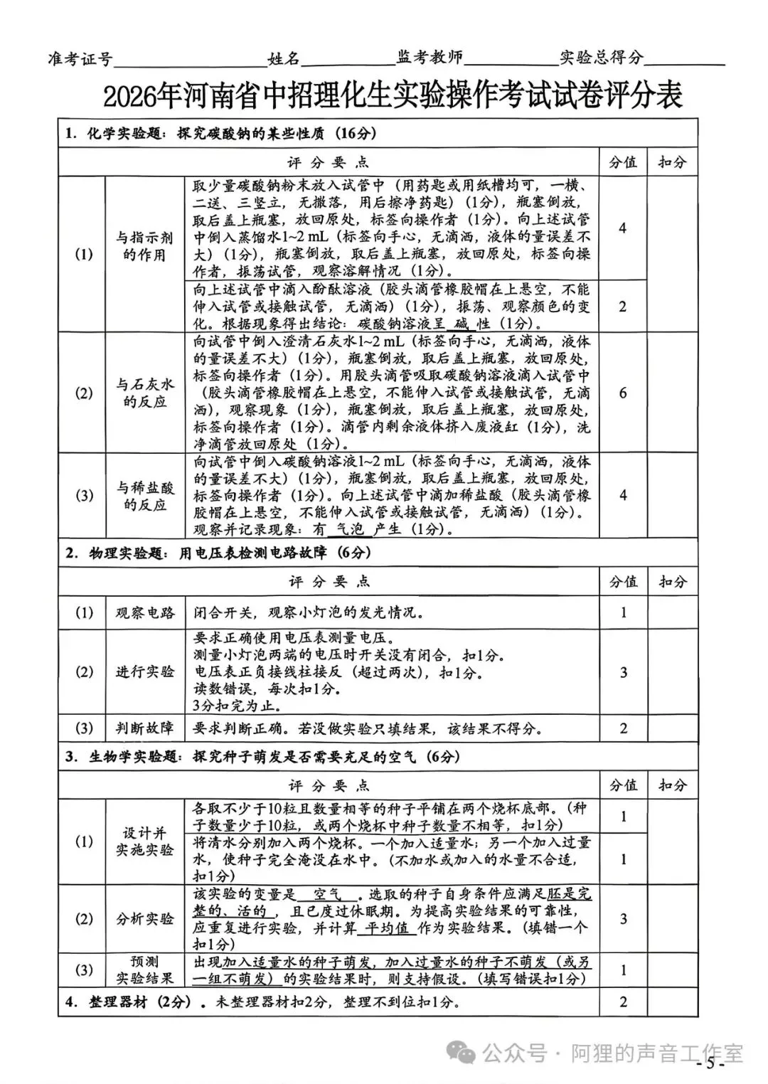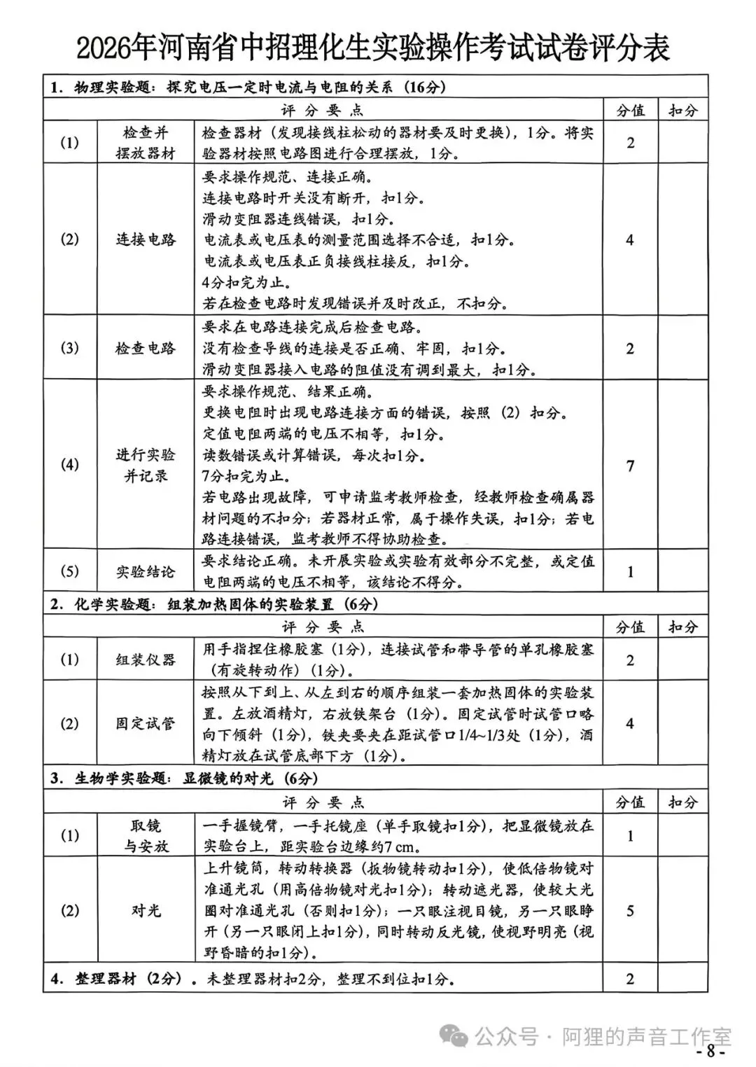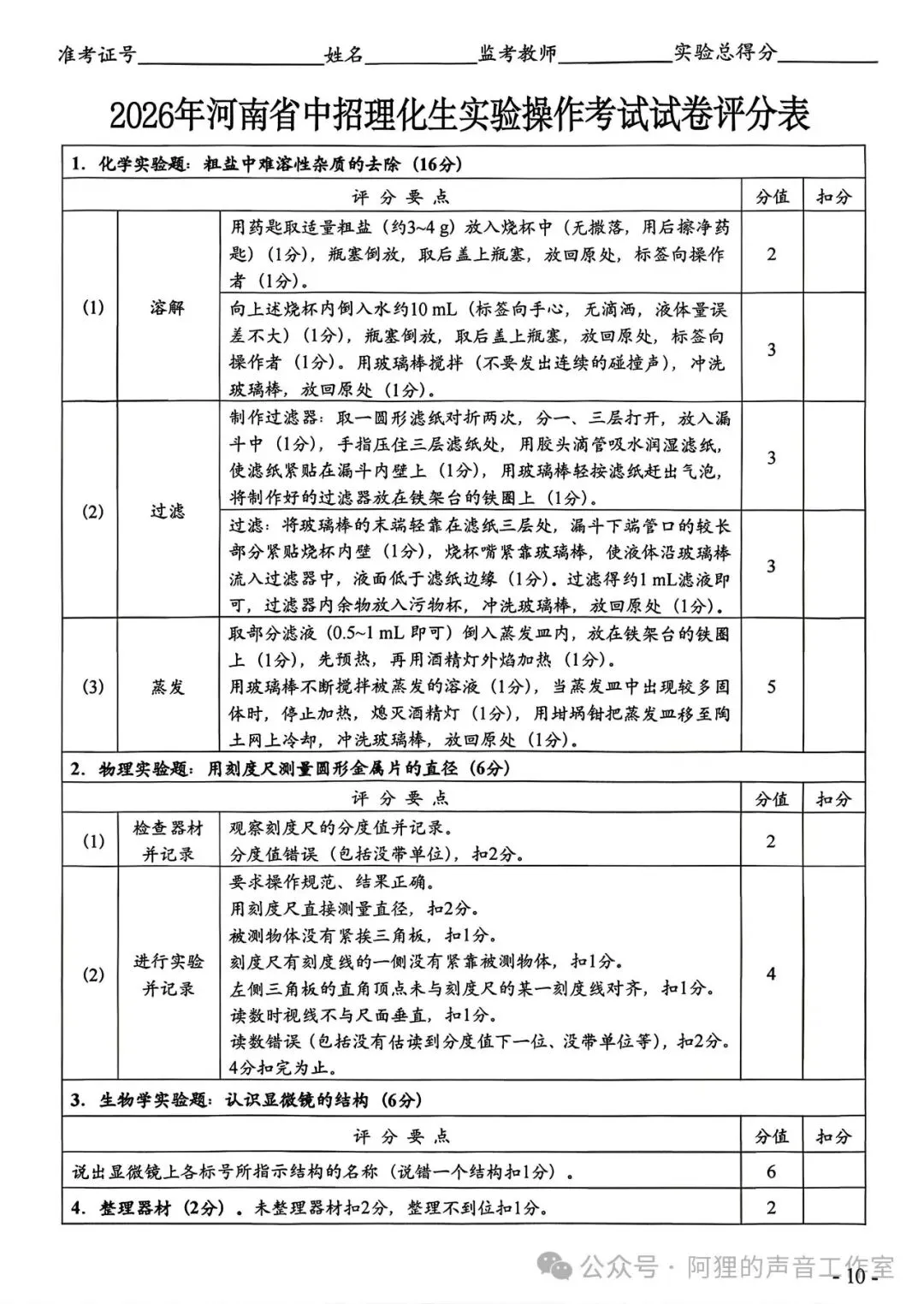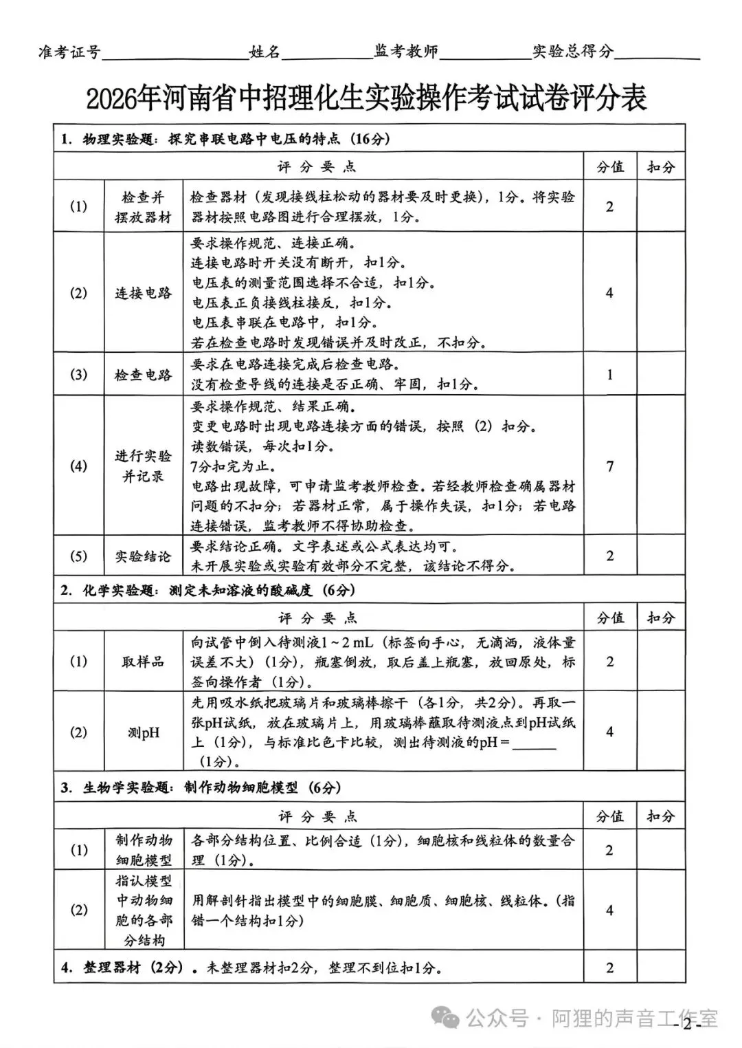 >2026年河南省中招理化生实验操作考试试卷评分表