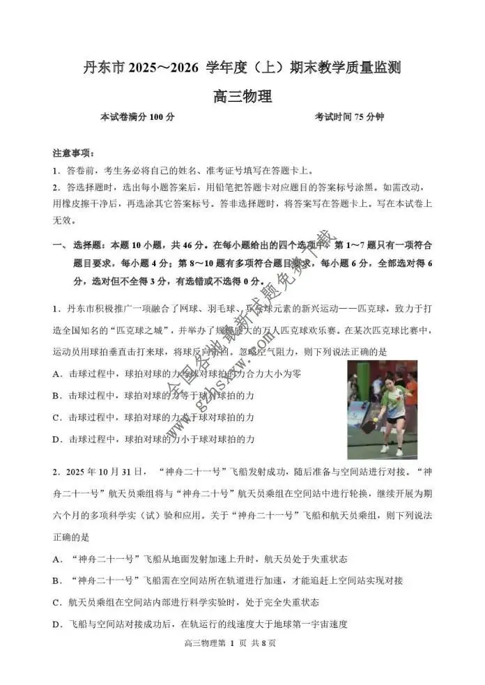 《高中试卷》辽宁省丹东市2026届高三上学期期末教学质量监测物理试卷(含答案)