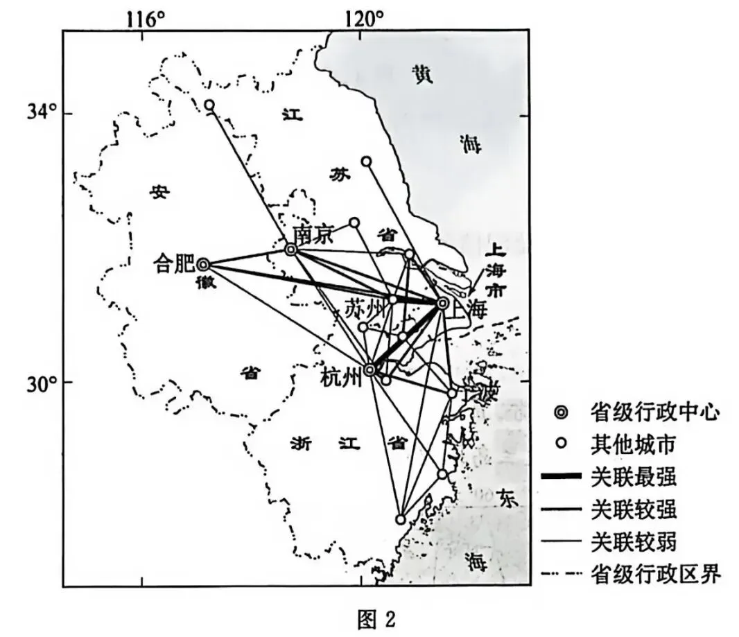跨区域技术转移能够有效促进创新资源的流动和配置。在区域互动中,与某城市联系最紧密、关联最强的城市,称为该城市的首位关联城市。图 2 为长江三角洲城市群部分城市间的技术转移网络关联强度示意。据此完成 4~5 题。