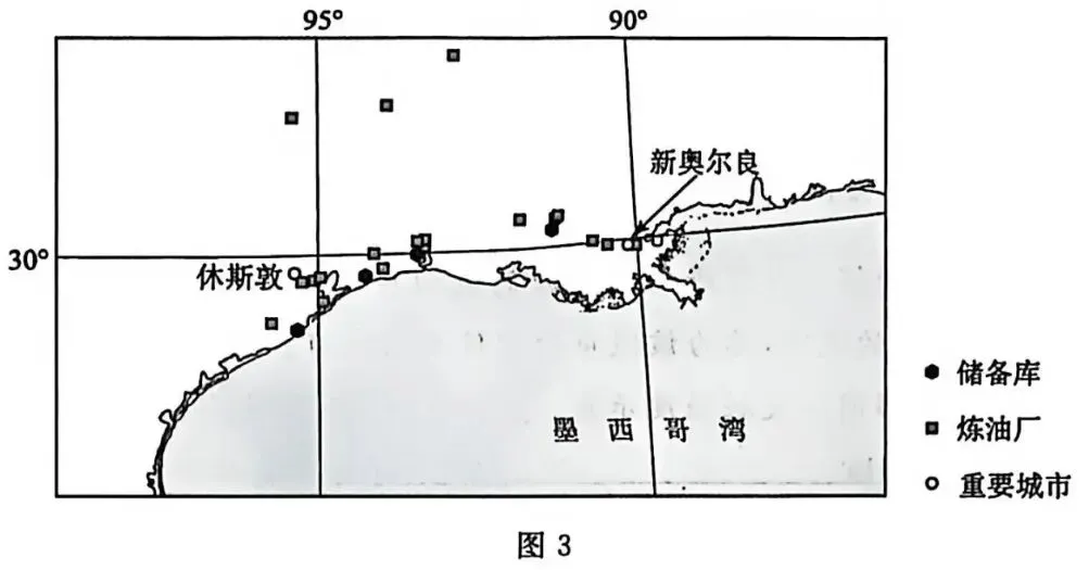美国拥有世界上最多的石油战略储备,其储备库(图 3)由数十个地下盐洞改造而成,储存了约7亿桶原油。这些盐洞的顶部距离地面达数百米,且具有极低的孔隙度和渗透率,洞壁上的微裂纹可自行修复。据此完成 6~7 题。