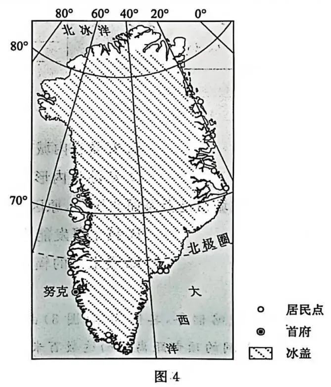 格陵兰岛常住人口约 5.7 万,其中努克常住人口约 1. 5 万。岛上冰盖面积广大,平均厚度约 2300 米。图 4 示意格陵兰岛地理位置和主要居民点分布。据此完成 8~10 题。