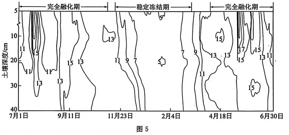 某野外科学观测研究站位于青藏高原季节性冻土区。图 5 为该站 2022 年 7 月—2023 年 6 月观测的不同深度土壤中未冻结水分含量(%)变化。据此完成 11~13 题。
