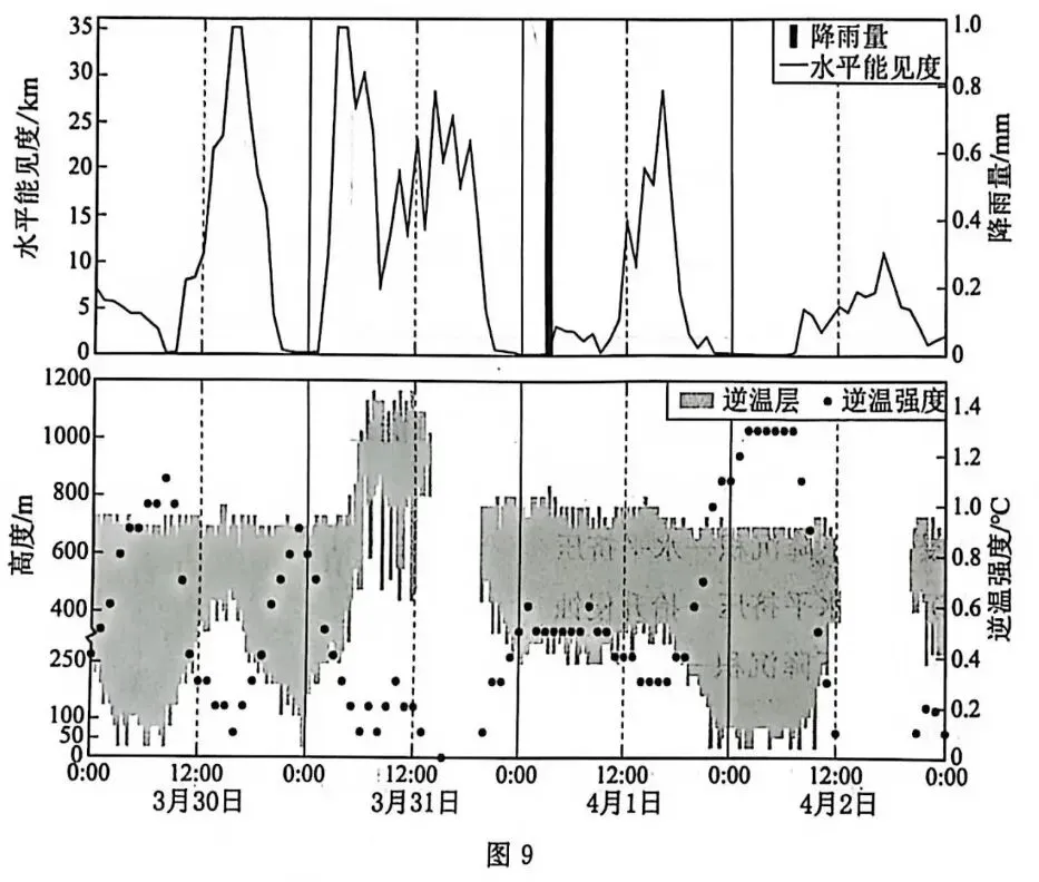 雾是低层大气中悬浮大量水滴或冰晶颗粒而使水平能见度小于 1km 的天气现象。逆温是指在特定条件下对流层中某一区域内气温随高度上升而升高的现象,逆温强度可用逆温层顶温度与逆温层底温度之差来表示。图 9 为台湾海峡西岸某气象观测站在某年 4 月 1 日前后连续 4 天逐小时水平能见度、逆温层厚度、逆温强度和部分降雨量的观测结果。