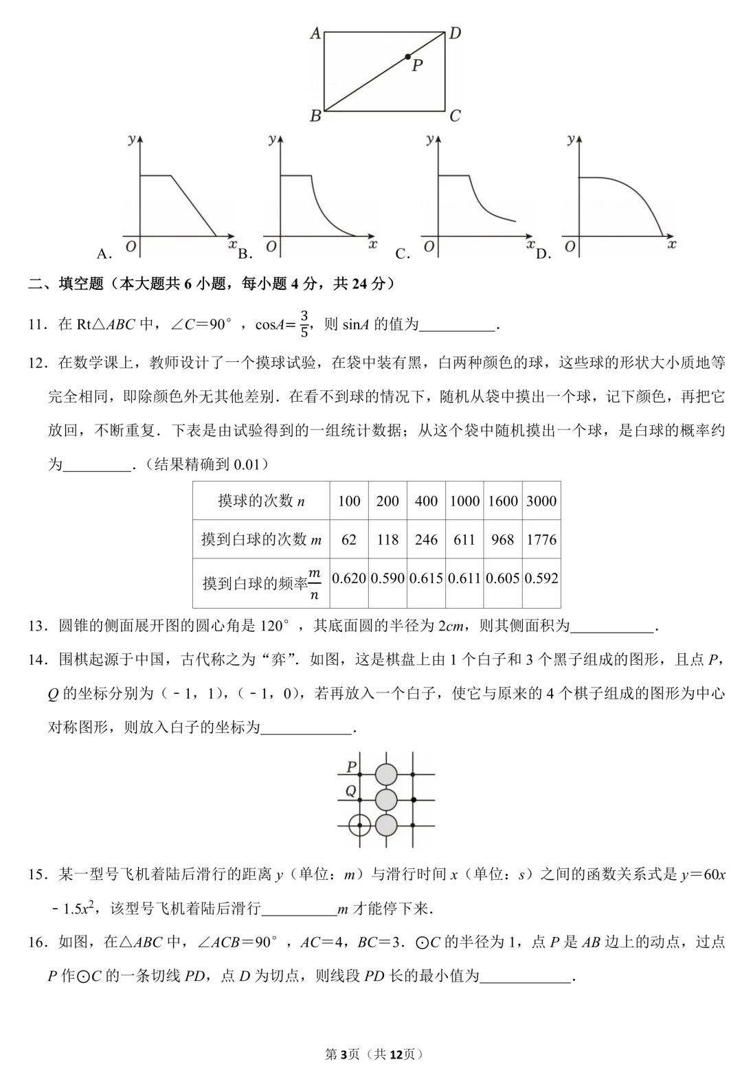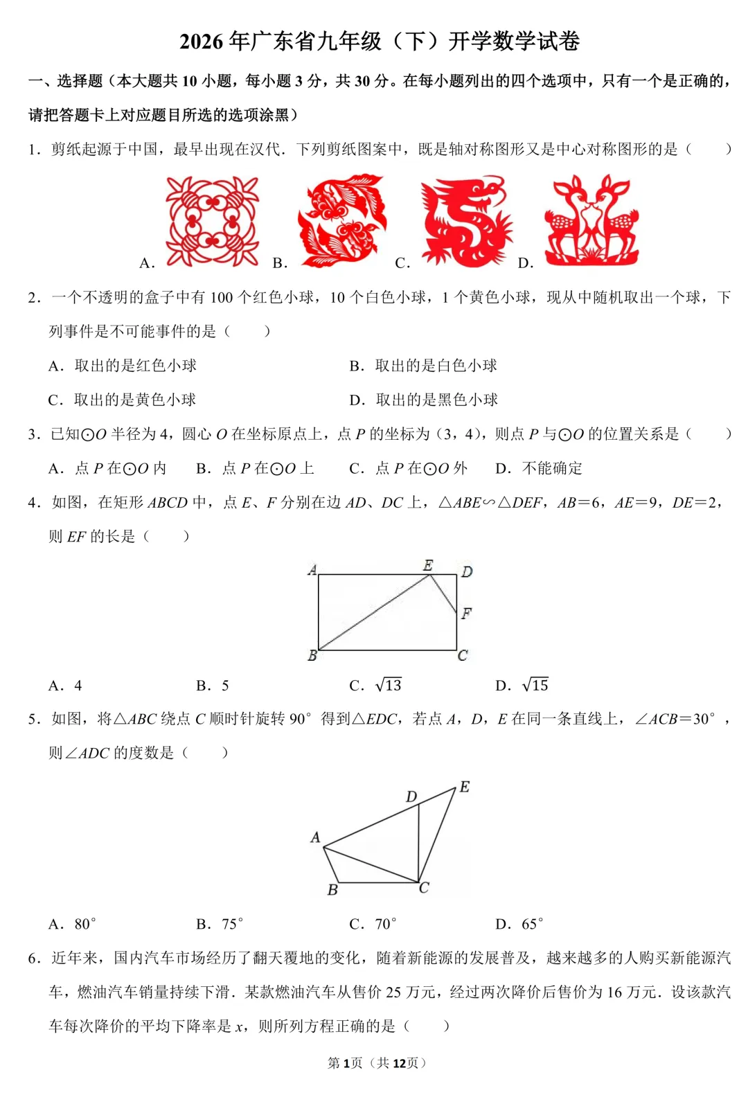>2026年广东省九年级下学期3月数学试卷(含答案)