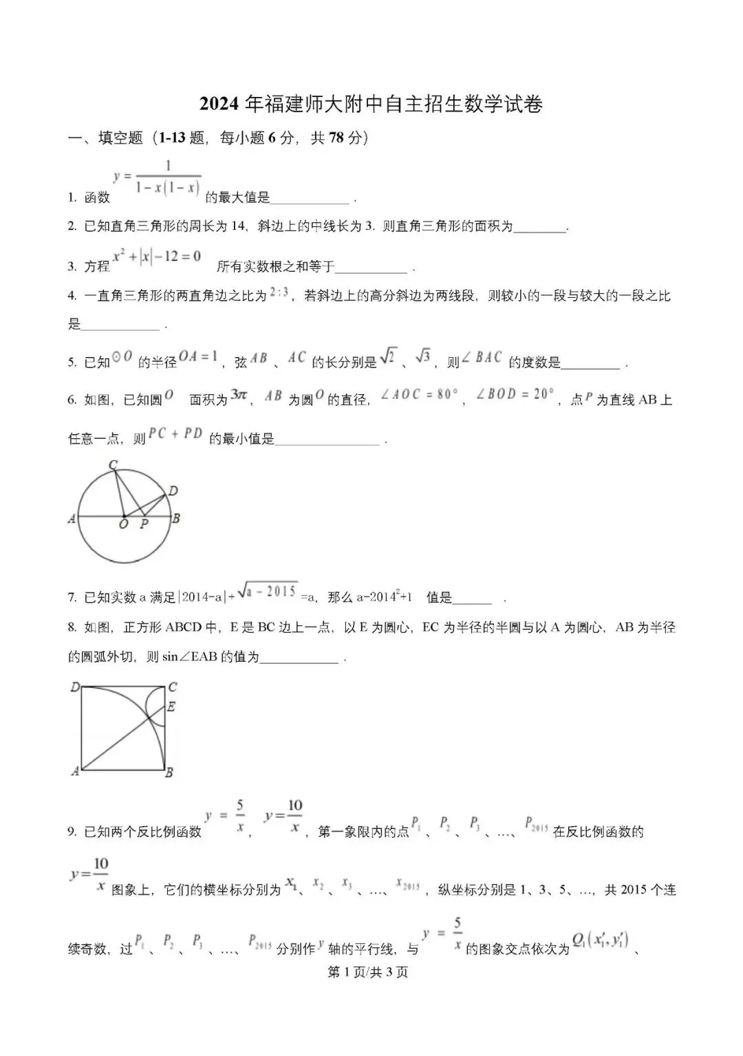 综上,2024 年福建师大附中自主招生数学试卷是一份 “基础扎实、能力至上、区分度高” 的优质试卷,既考查了学生的初中数学基础,又检验了学生的数学核心素养,对初三学子备考名校自主招生具有重要的参考价值。