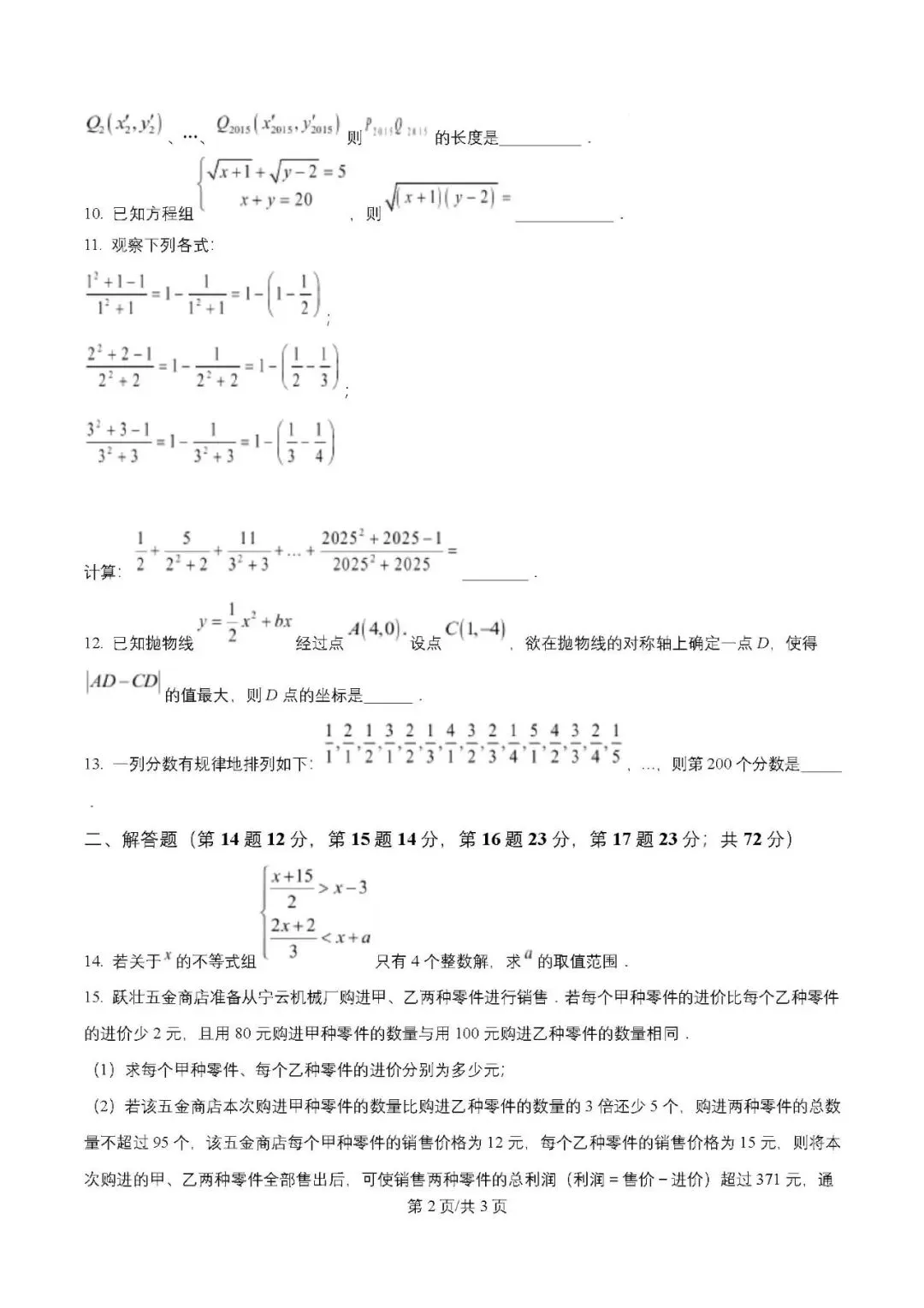 - 规律探究与综合题(10-13 题):是填空题的难度高峰,考查换元法解无理方程、裂项相消法求和、抛物线对称轴与距离最值、数字规律探究,对学生的思维能力和解题技巧要求显著提升。如第 11 题的裂项相消求和,需要学生先根据已知规律对通项进行变形,再消去中间项计算,对规律的观察和归纳能力是关键;第 13 题的分数规律探究,需将分数分组并总结每组的分子、分母特征,结合等差数列求和确定第 200 个分数的位置,计算量不大但规律分析难度较高,容易出错。