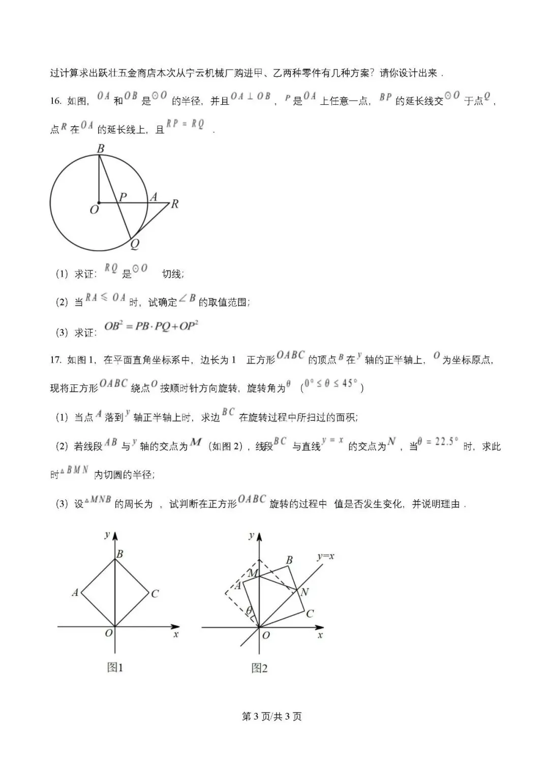 - 第 17 题(正方形旋转综合题):融合正方形的性质、旋转的性质、扇形面积计算、三角形内切圆、全等三角形判定与性质等考点,对学生的数形结合、辅助线构造、逻辑推理能力要求极高。第一问求 BC 扫过的面积,只需转化为 “扇形面积的差”,属于基础几何计算;第二问求三角形内切圆半径,需先利用等腰直角三角形性质求出边长,再结合内切圆半径公式计算,步骤较多,计算量稍大;第三问判断三角形周长是否为定值,是本题的难点,需要通过构造全等三角形将线段进行转化,证明周长等于正方形边长的 2 倍,对学生的综合分析和辅助线构造能力要求极高,是试卷的压轴难点。