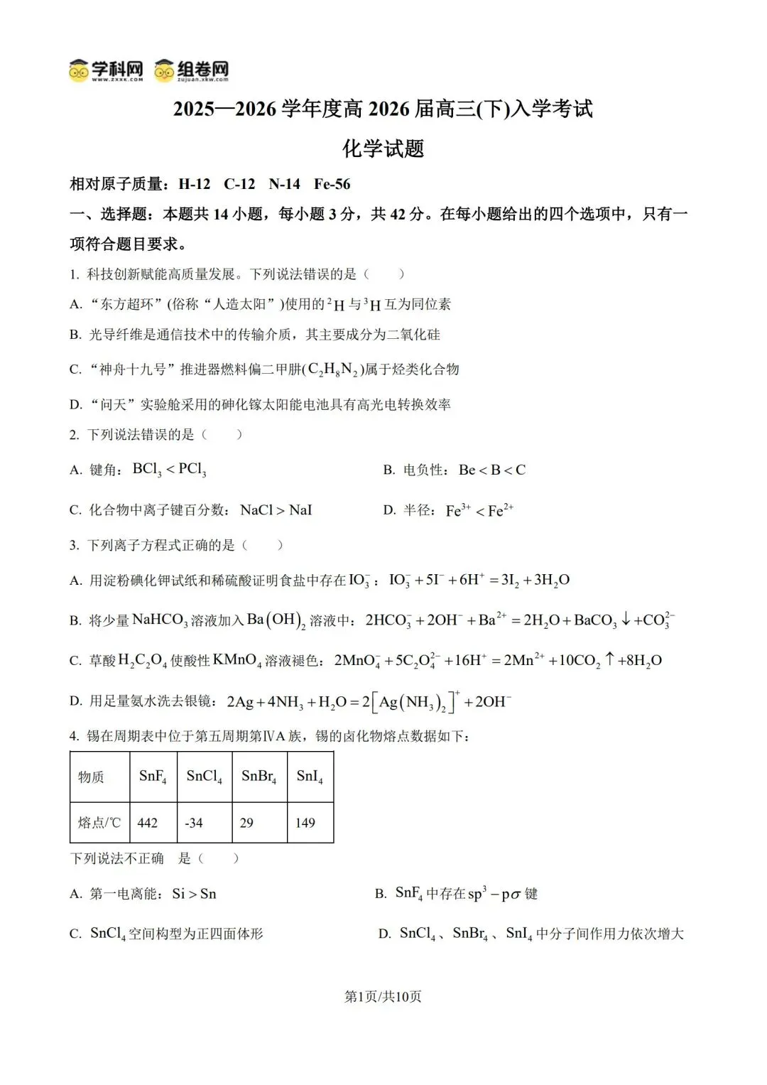 >重庆八中2026届高三下入学考试化学试卷+参考答案