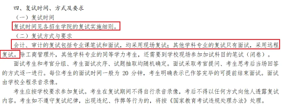 会计、审计的复试包括专业课笔试和面试,均采用现场复试;其他学科专业的复试只有面试,采用远程复试。