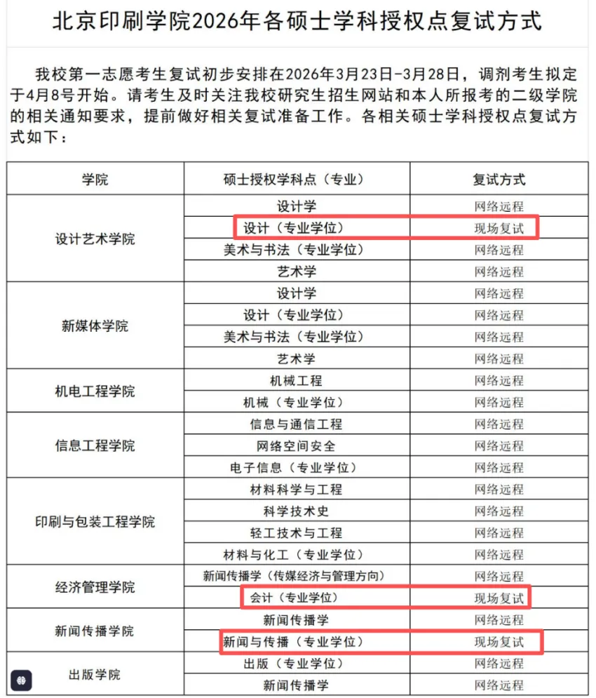 北京印刷学院研究生院官网发布通知,设计(专业学位)、会计(专业学位)、新闻与传播(专业学位)这三个专业需现场复试,其他专业均采用网络远程的复试形式。
