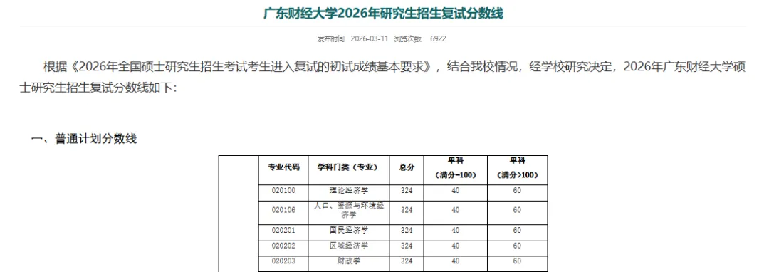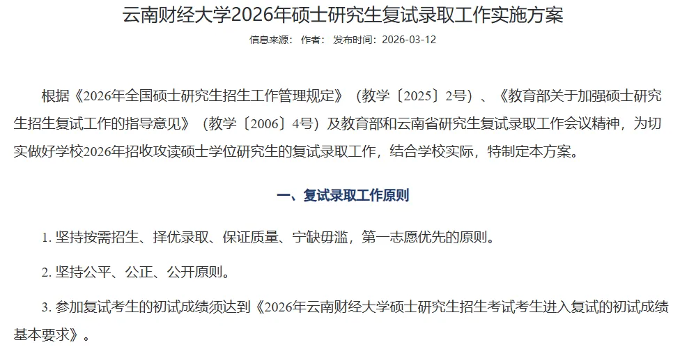云南财经大学发布26考研复试分数线和复试录取工作实施方案: