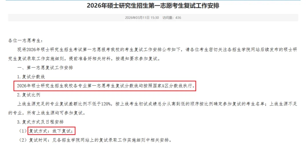 2026年硕士研究生招生我校各专业第一志愿考生复试分数线均按照国家A区分数线执行。采取线下复试方式。