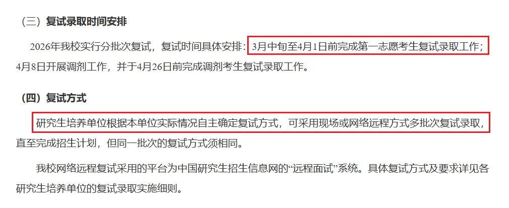 3月中旬至4月1日前完成第一志愿考生复试录取工作,各学院根据实际情况选择现场或网络远程复试。