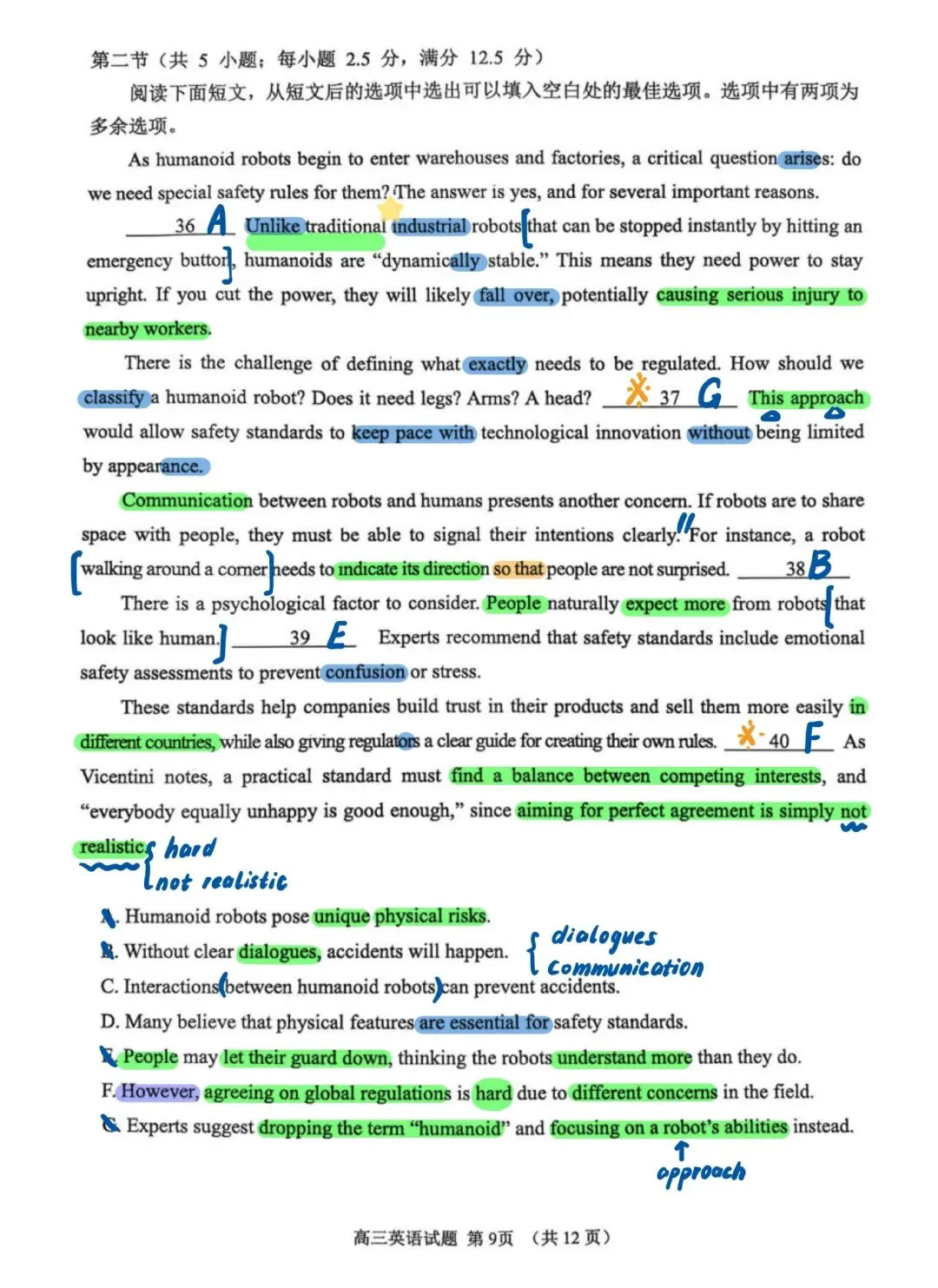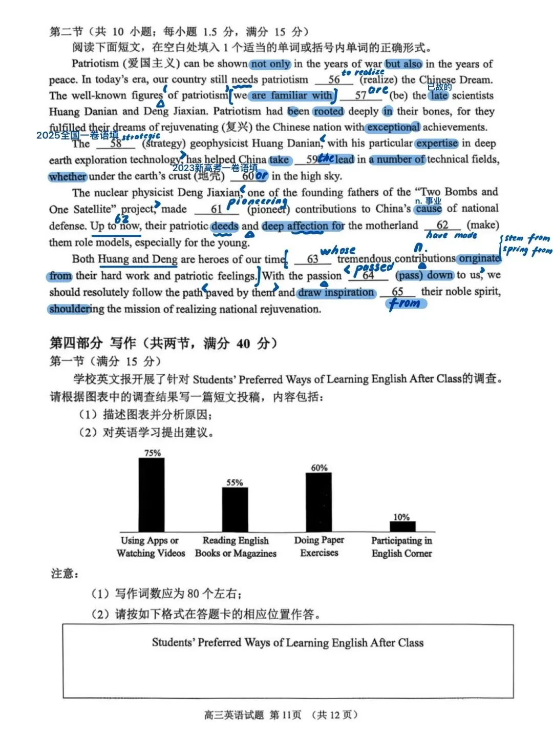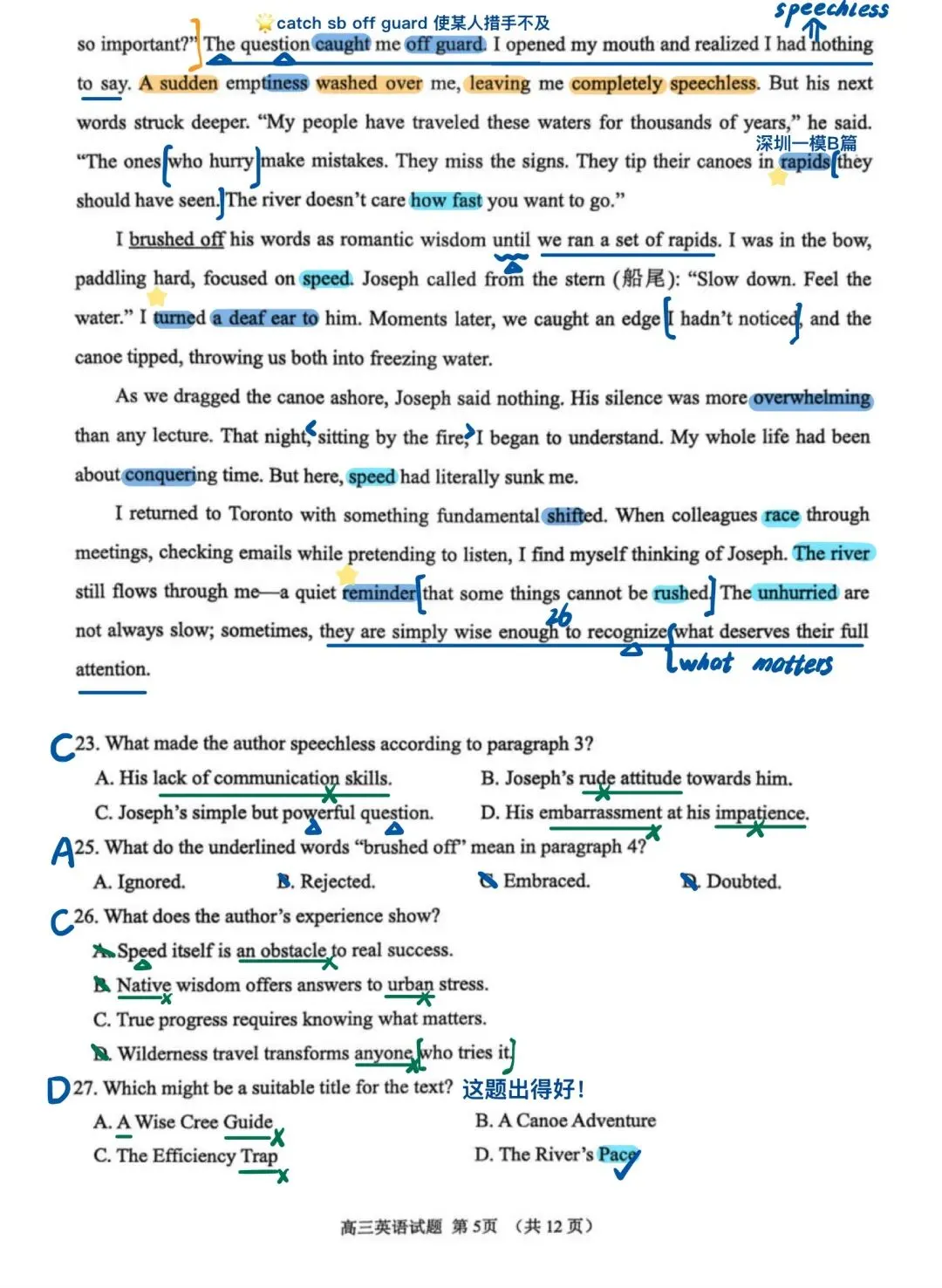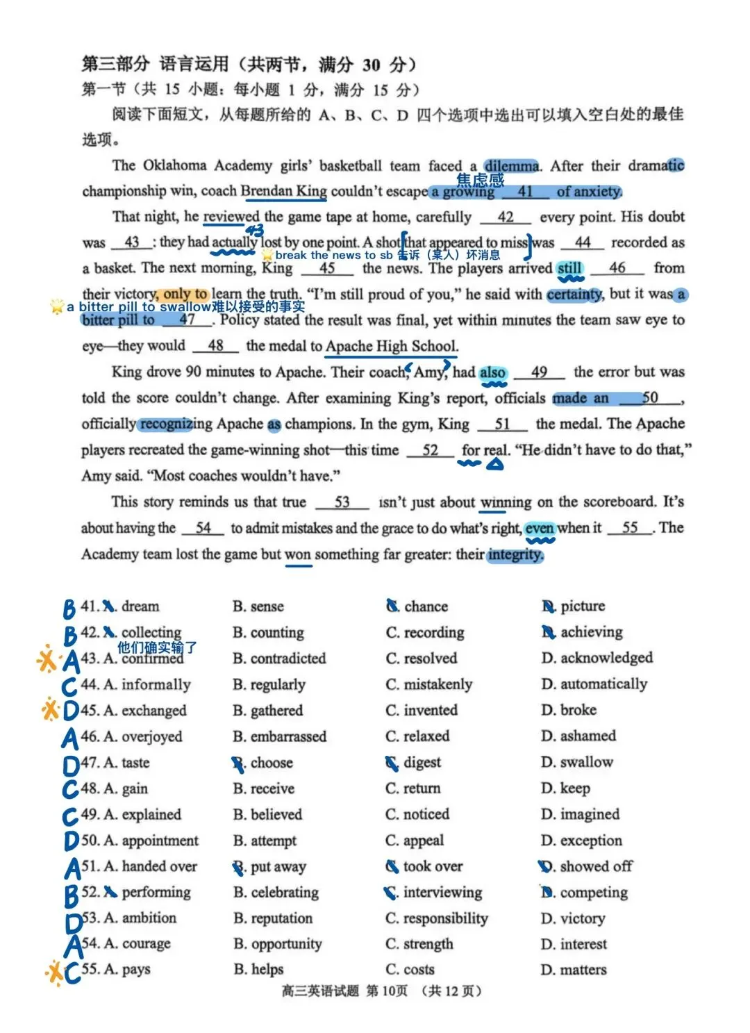 近期山东模考做过的试题中,我最喜欢这套试卷!首先难度肯定是有的,但不是“强人所难”其次,该套试卷在选材方面非常出色。不再是一些考了无数次的人间温情小故事、二氧化碳、珊瑚……所选篇章皆有意义,即便B篇是个人转变类文章,也有新的感觉,其中27题出得很好另外该套试卷涵盖了很多重点词汇和表达,很适合检验一轮复习的成果,也有不少值得学习之处,如完形45题、47题C篇在话题上对标25年全国一卷C篇D篇阅读最大的障碍似乎不是理解难度,而是心里那一关,考验考生面对生僻话题能否克服“畏难情绪”,冷静分析。七选五注意37题、40题完形填空注意43题、 45 题和55题语法填空出得也很精良,有几道高考题的影子,值得练习