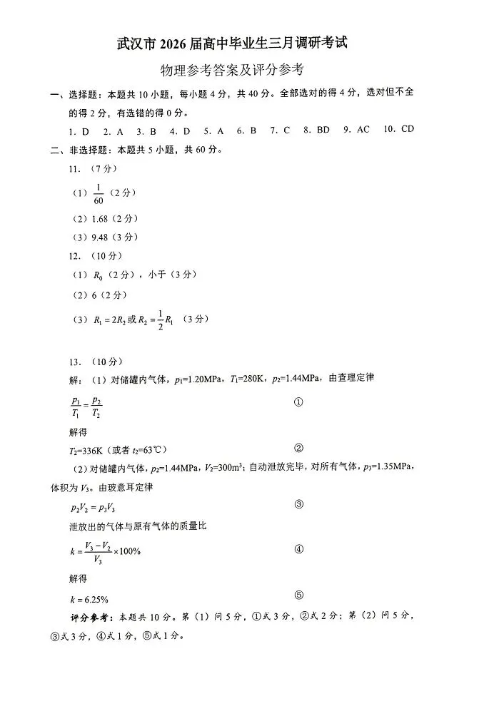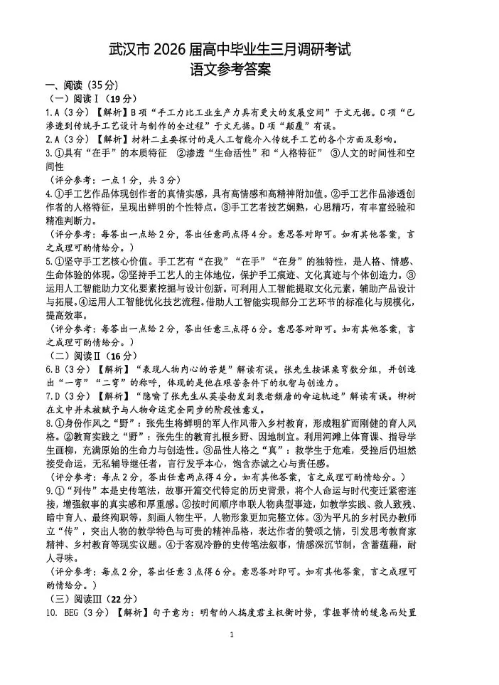 >武汉市2026届高三3月调研考部分试卷及参考答案分享