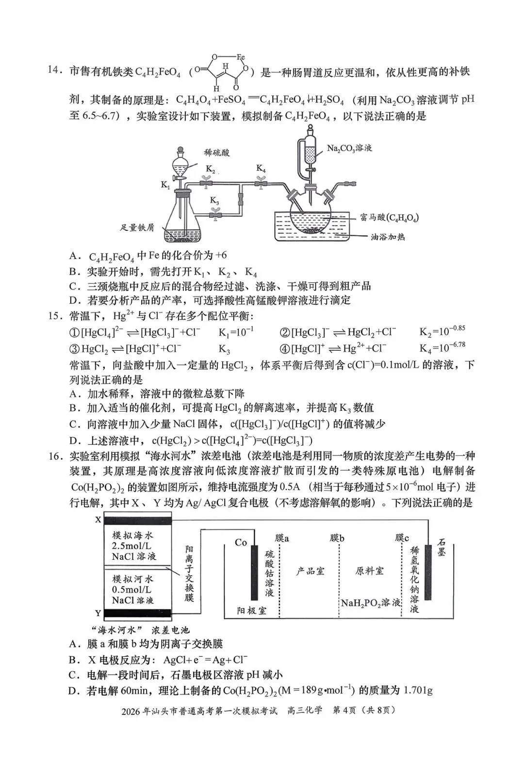 >2026年汕头一模化学试卷及参考答案