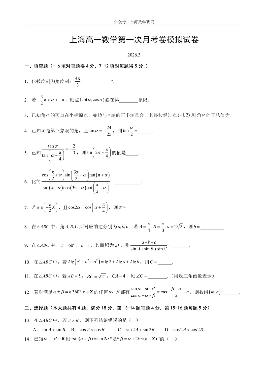 >上海高一数学第一次月考模拟试卷及答案(2026.3)