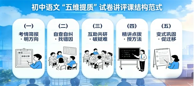 为构建高效试卷讲评课课堂,特提炼“五维提质”课堂结构范式。该范式以考情简报、自查自纠、互助共研、精讲点拨、变式巩固为核心环节,层层递进、环环相扣,既立足学情精准发力,又突出学生主体地位,助力实现知识补漏、方法提炼与思维提升的学习目标。如图: