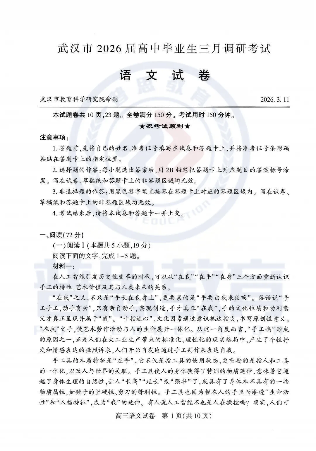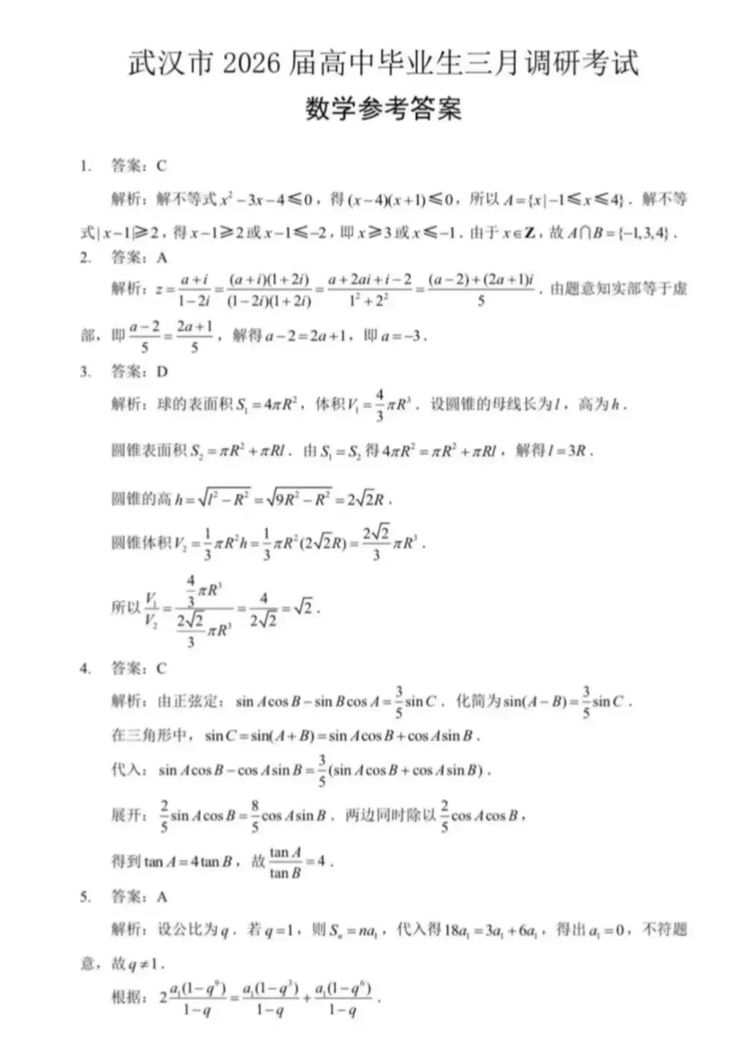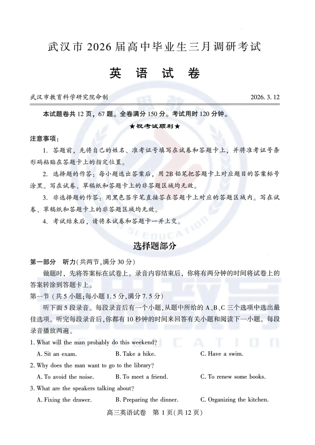 武汉市三月调考(武汉二调)全部科目试卷及答案已全部收集整理完毕!本次考试由武汉市教育科学研究院命题,质量精良、贴合高考,对后期复习极具参考价值。