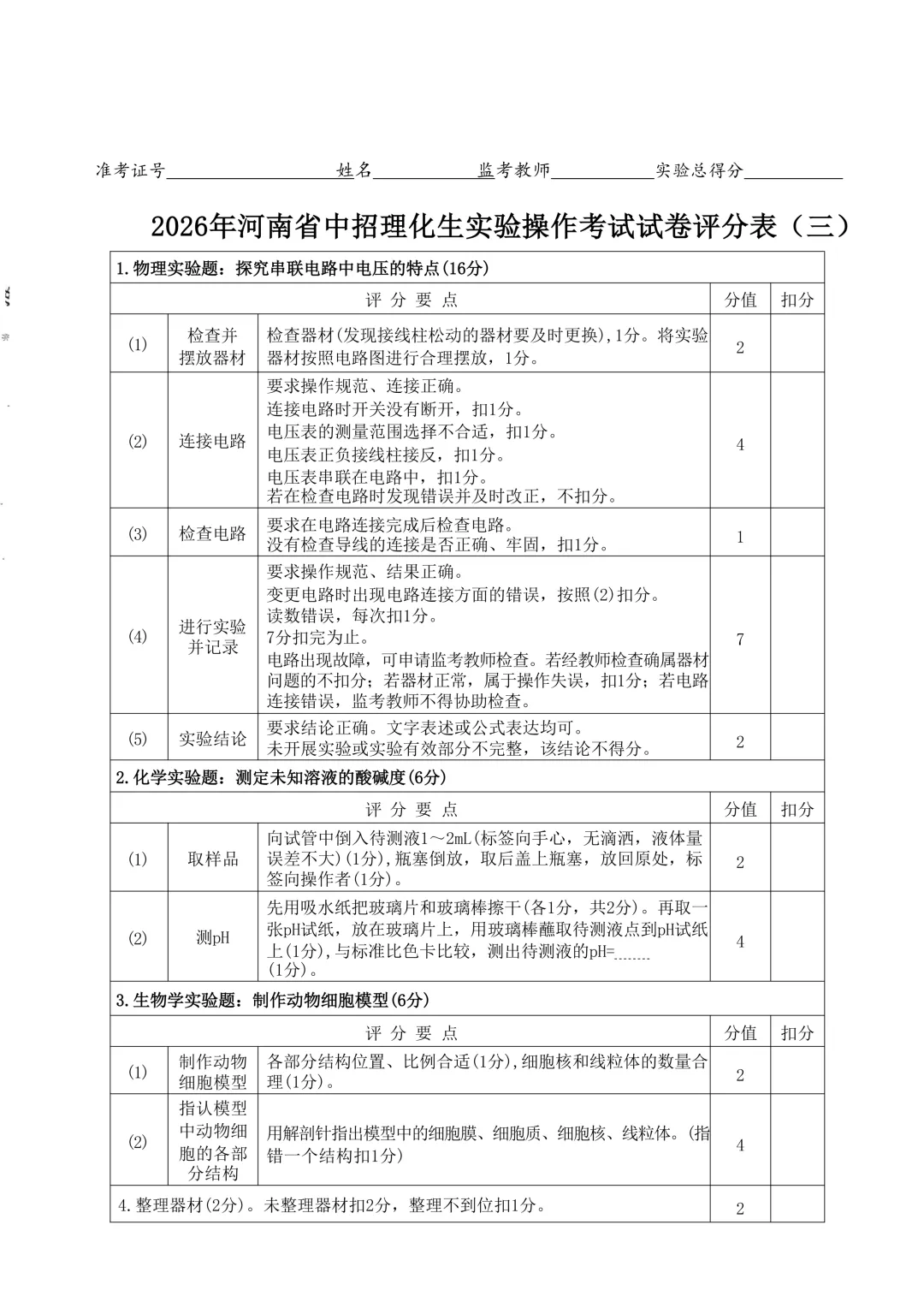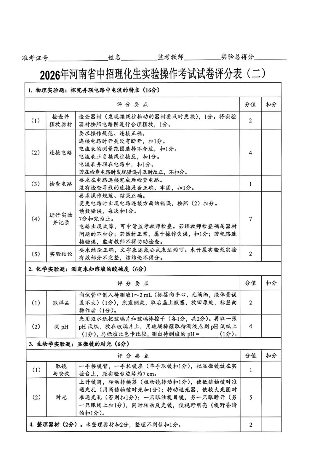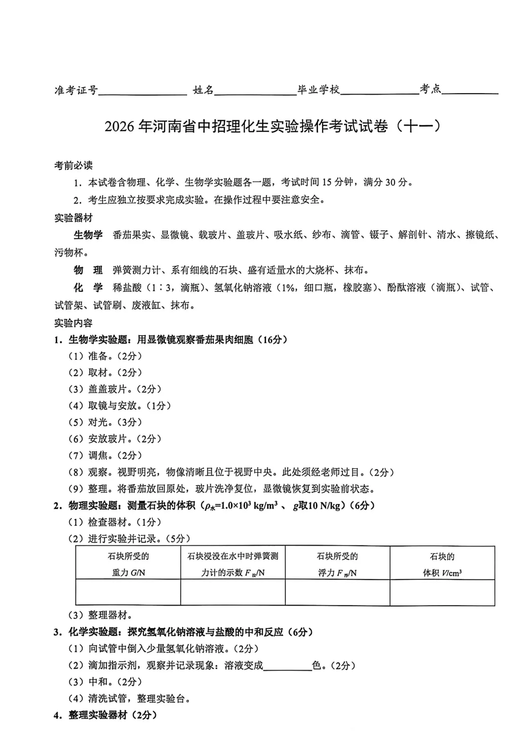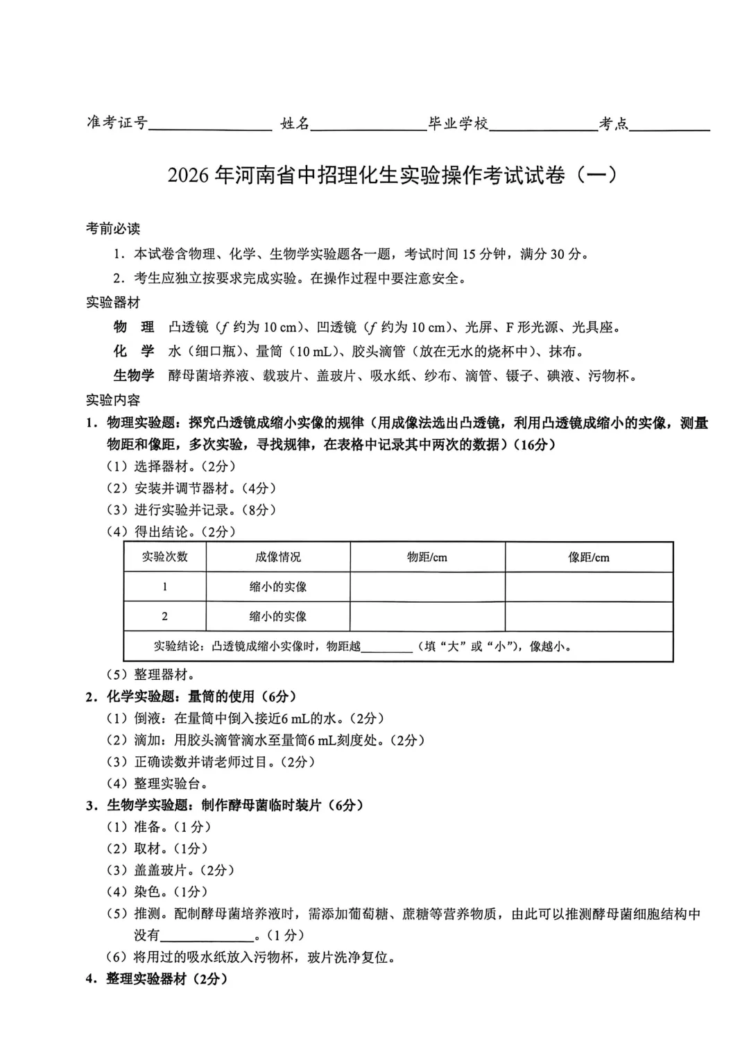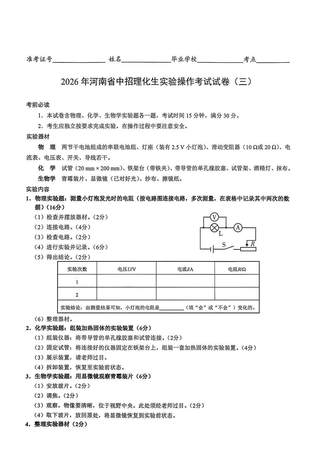 2026年河南省中招理化生实验操作考试试卷及评分表