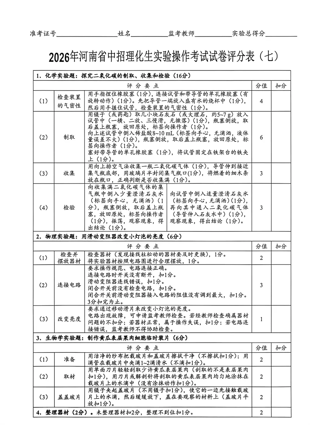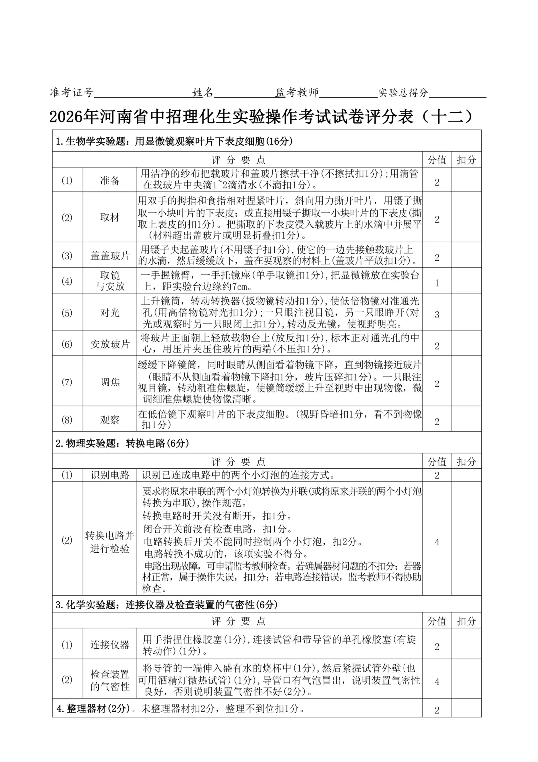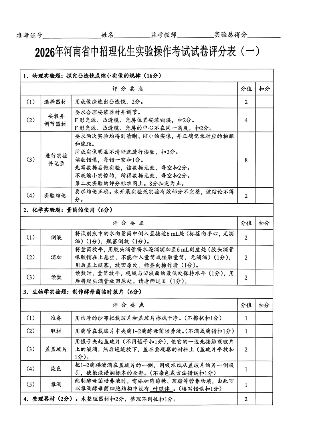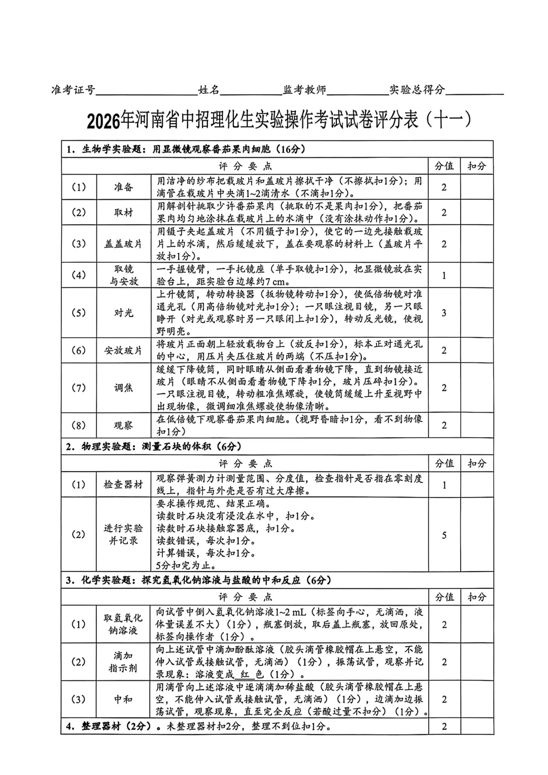 2026年河南省中招理化生实验操作考试试卷及评分表