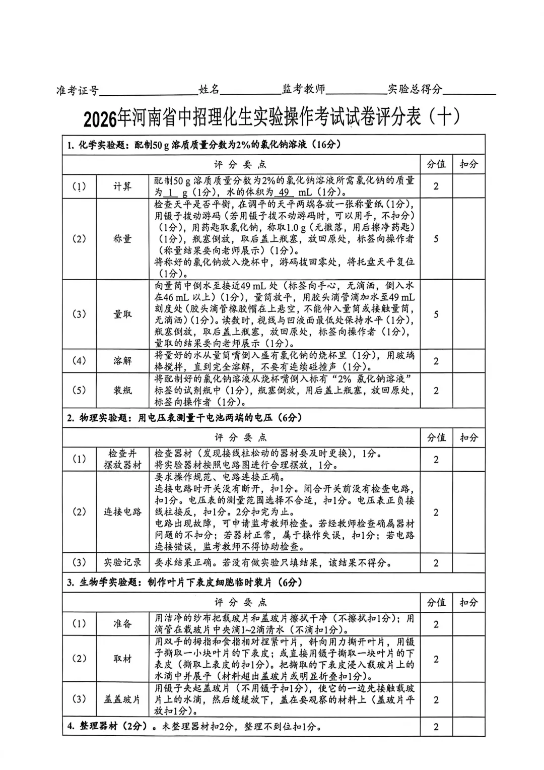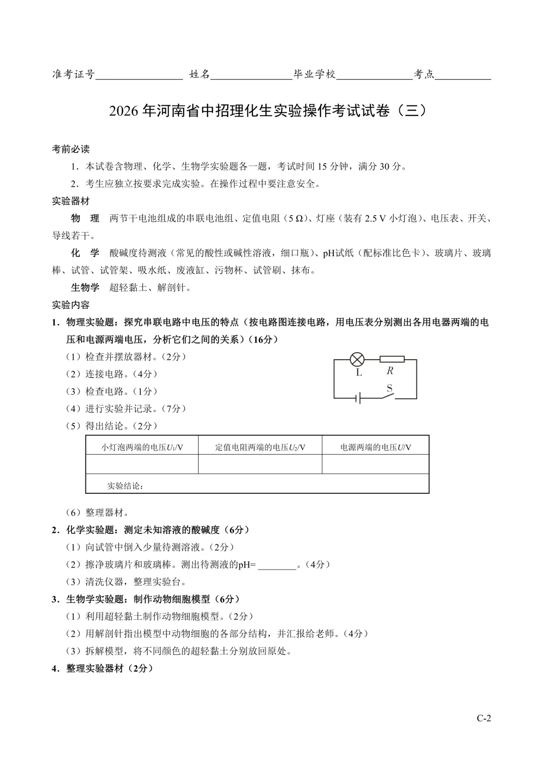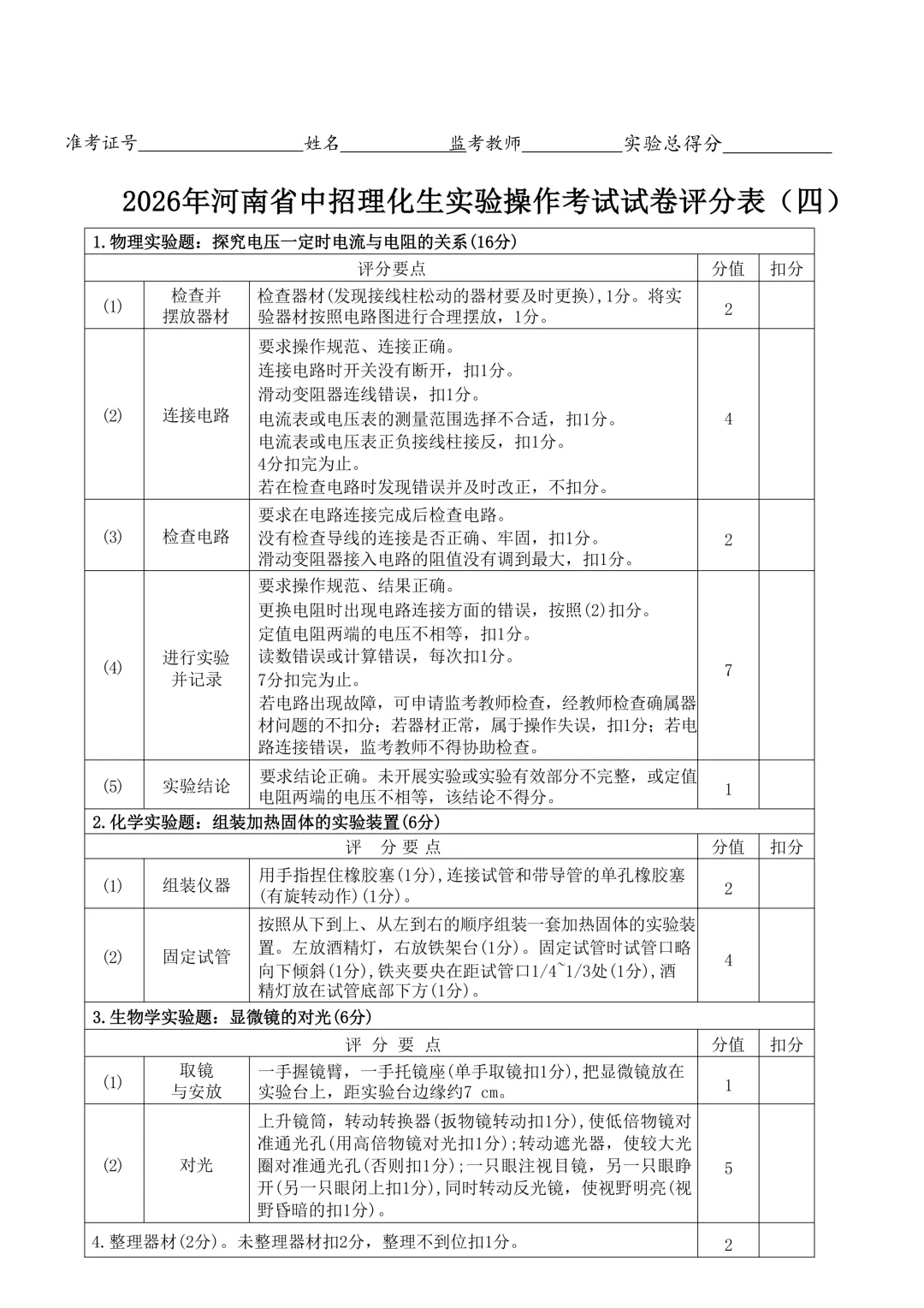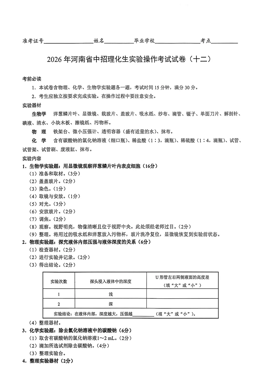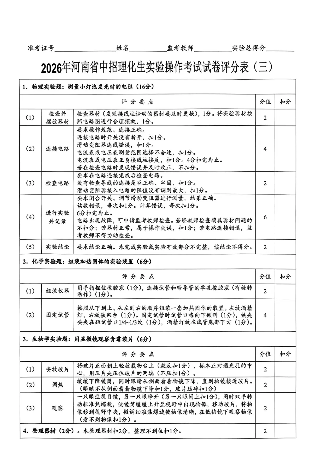 2026年河南省中招理化生实验操作考试试卷及评分表