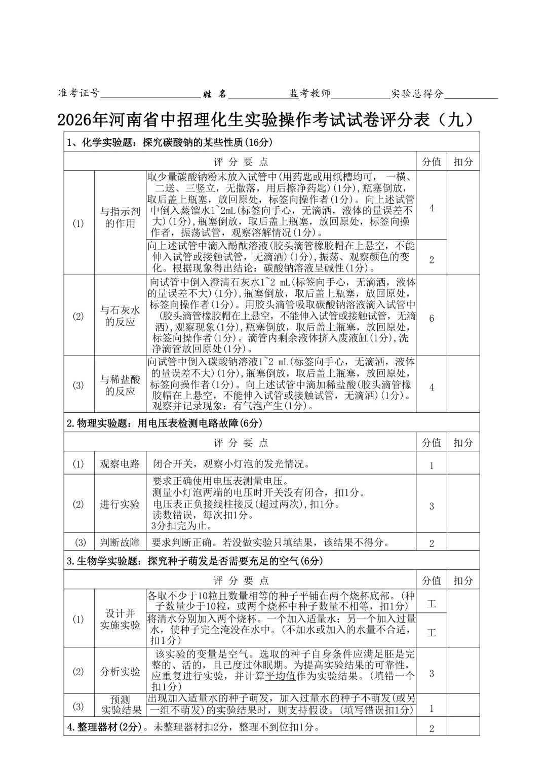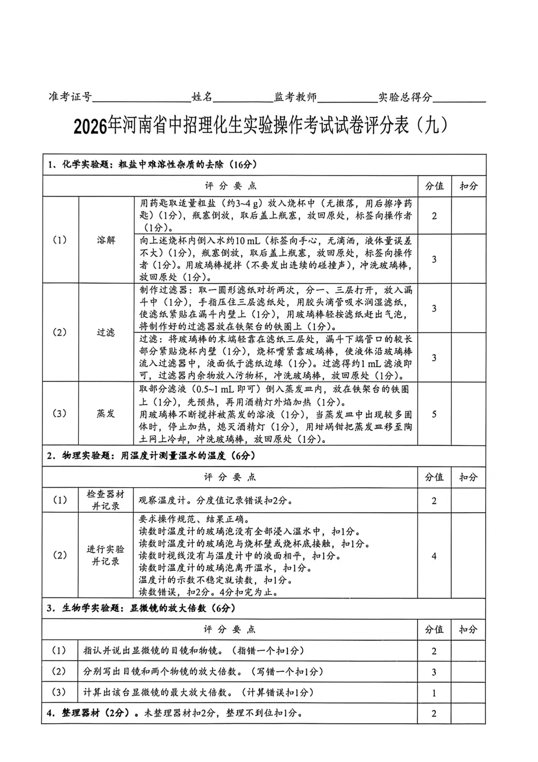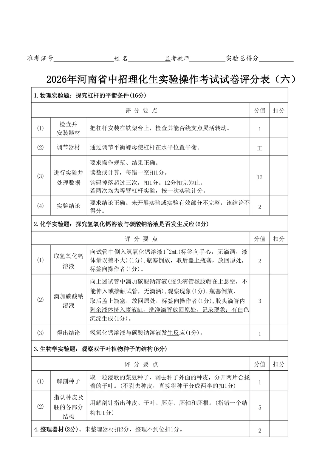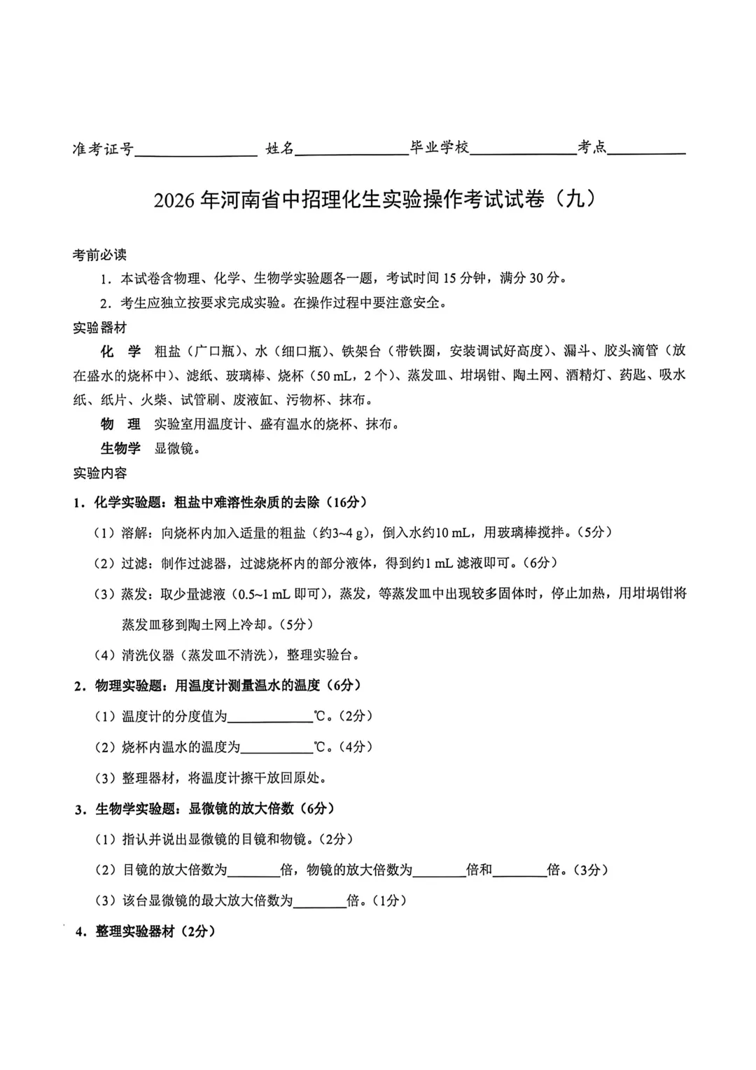 2026年河南省中招理化生实验操作考试试卷及评分表