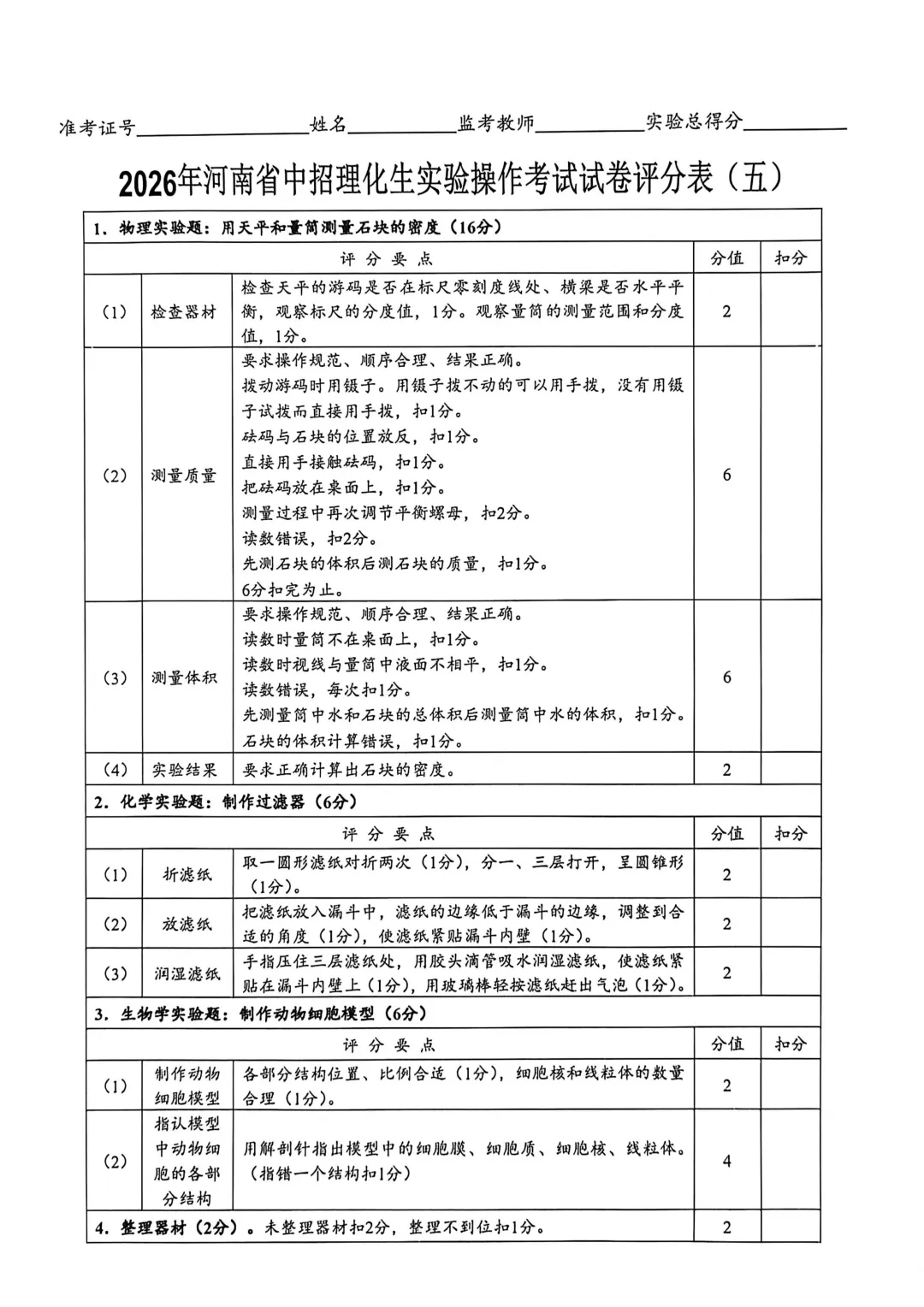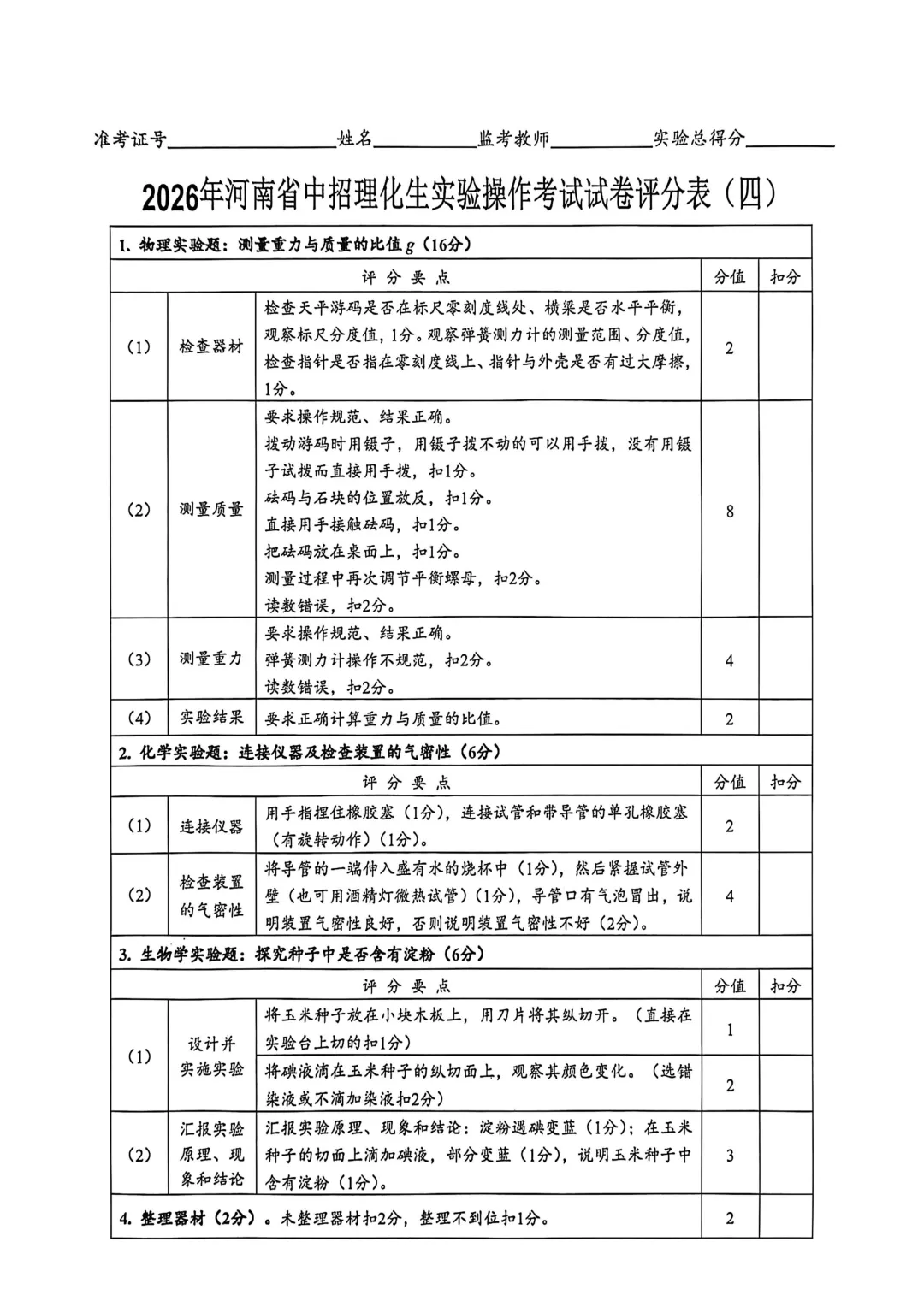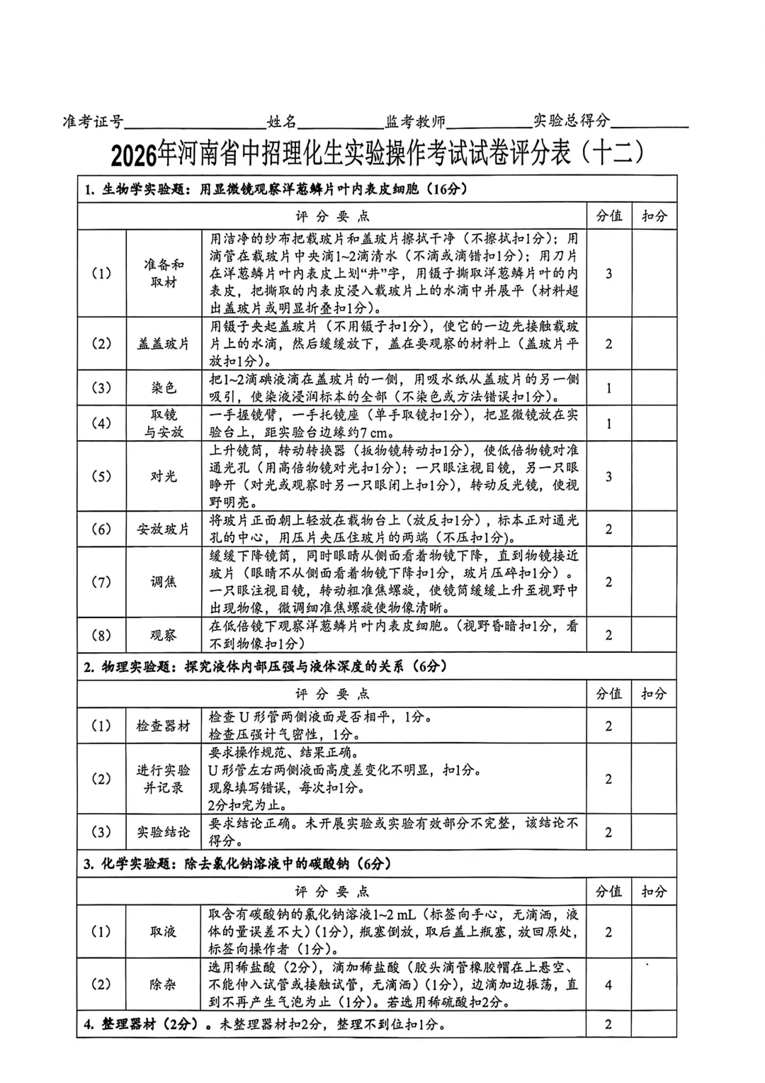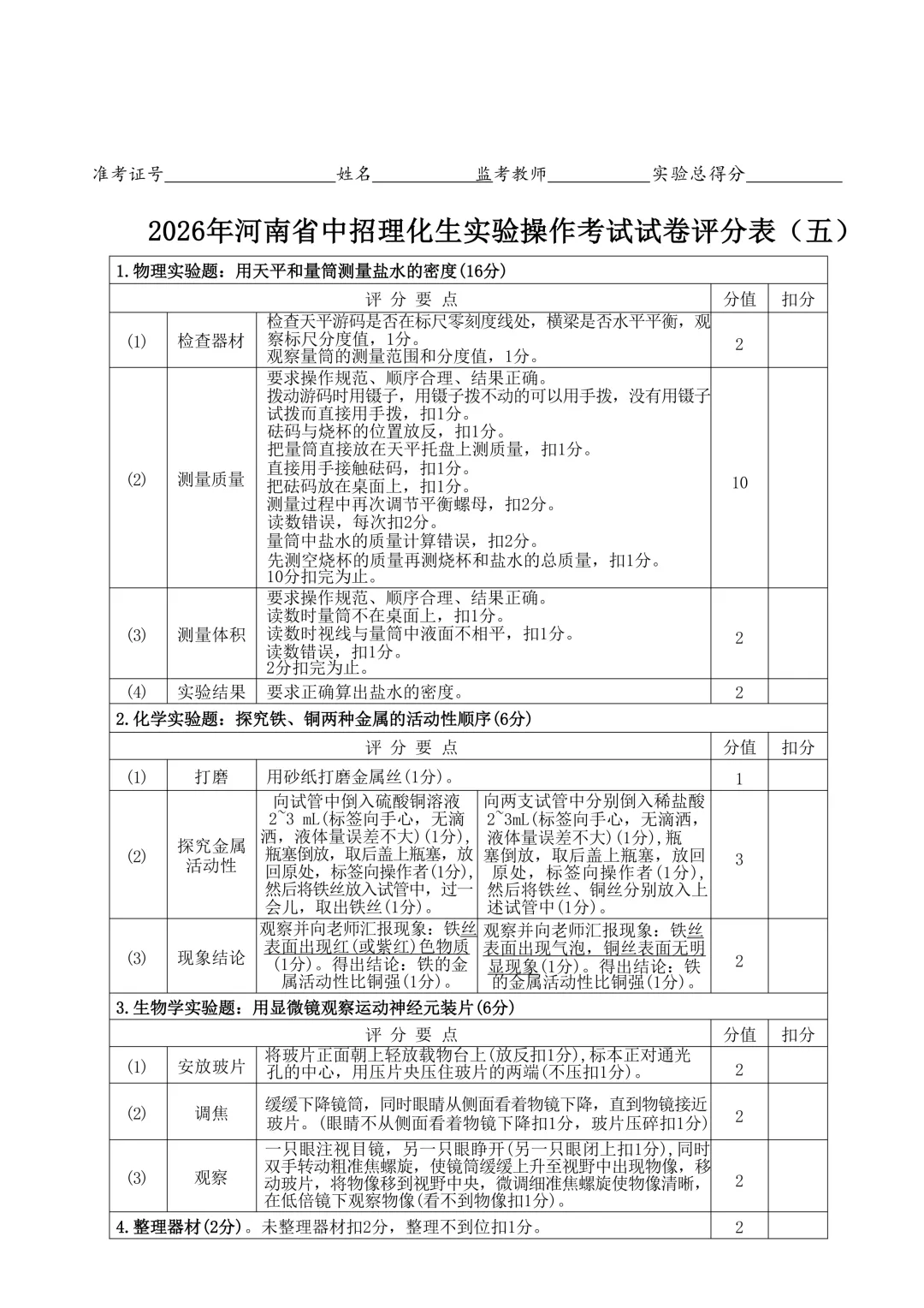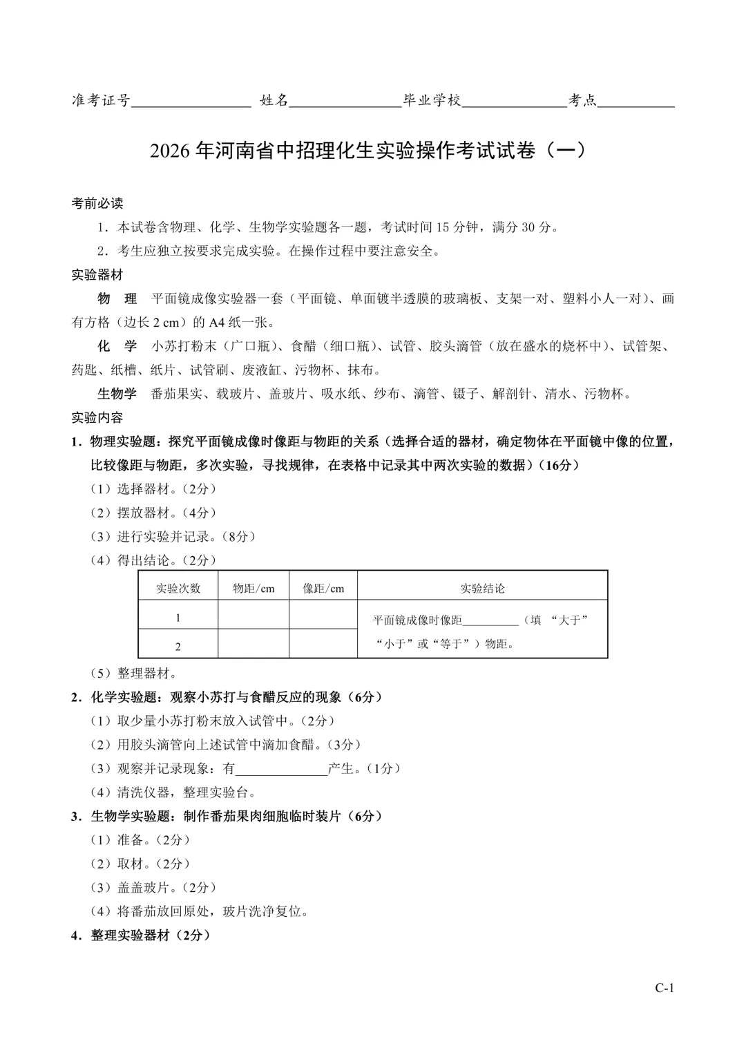 2026年河南省中招理化生实验操作考试试卷及评分表