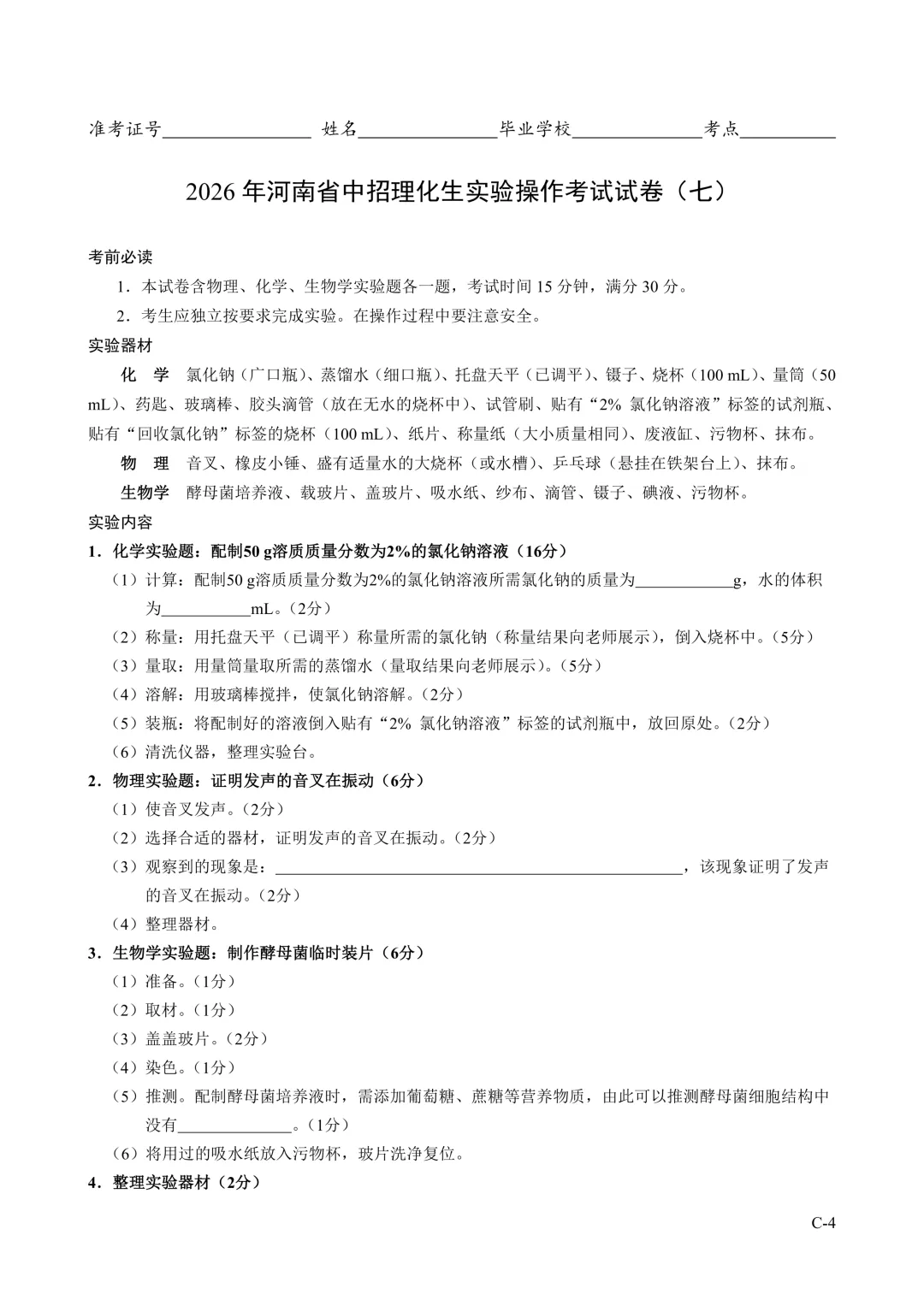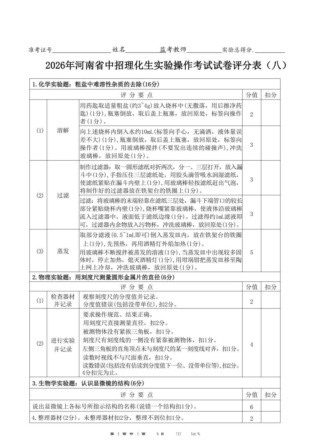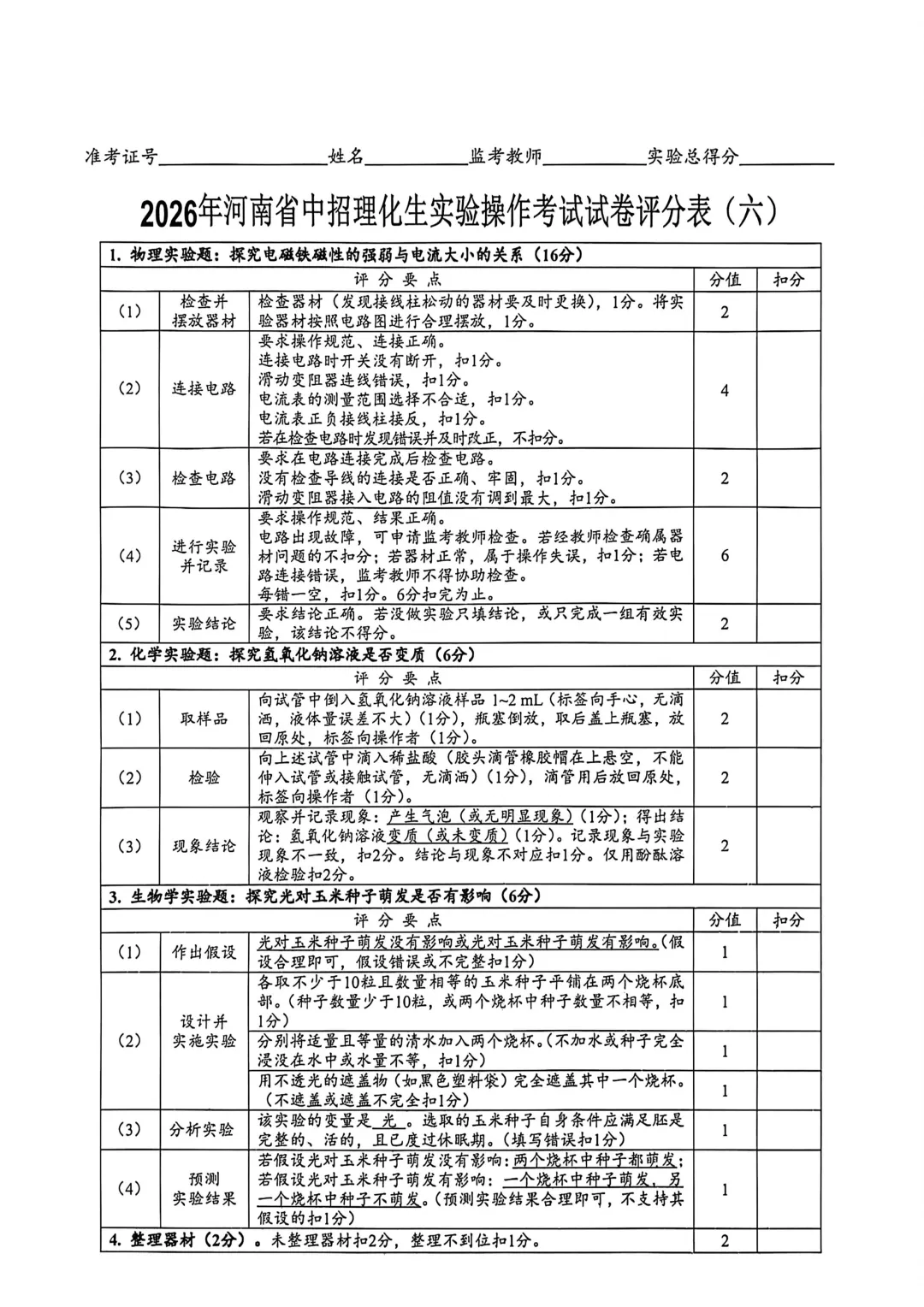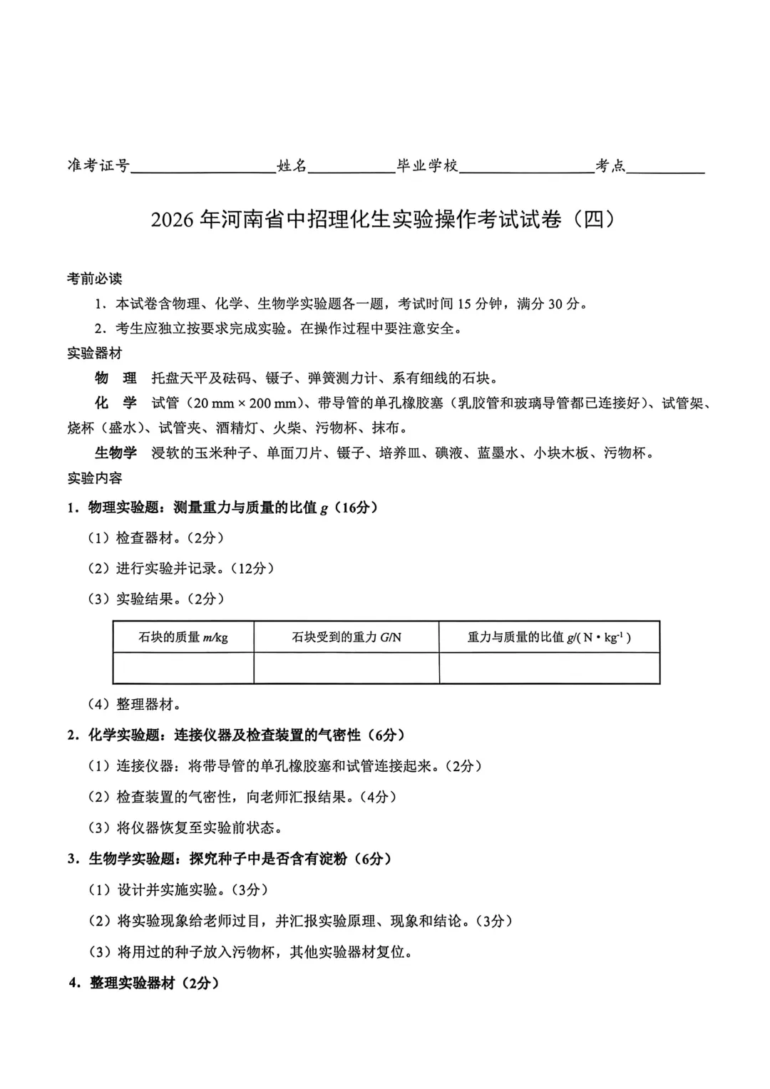 2026年河南省中招理化生实验操作考试试卷及评分表