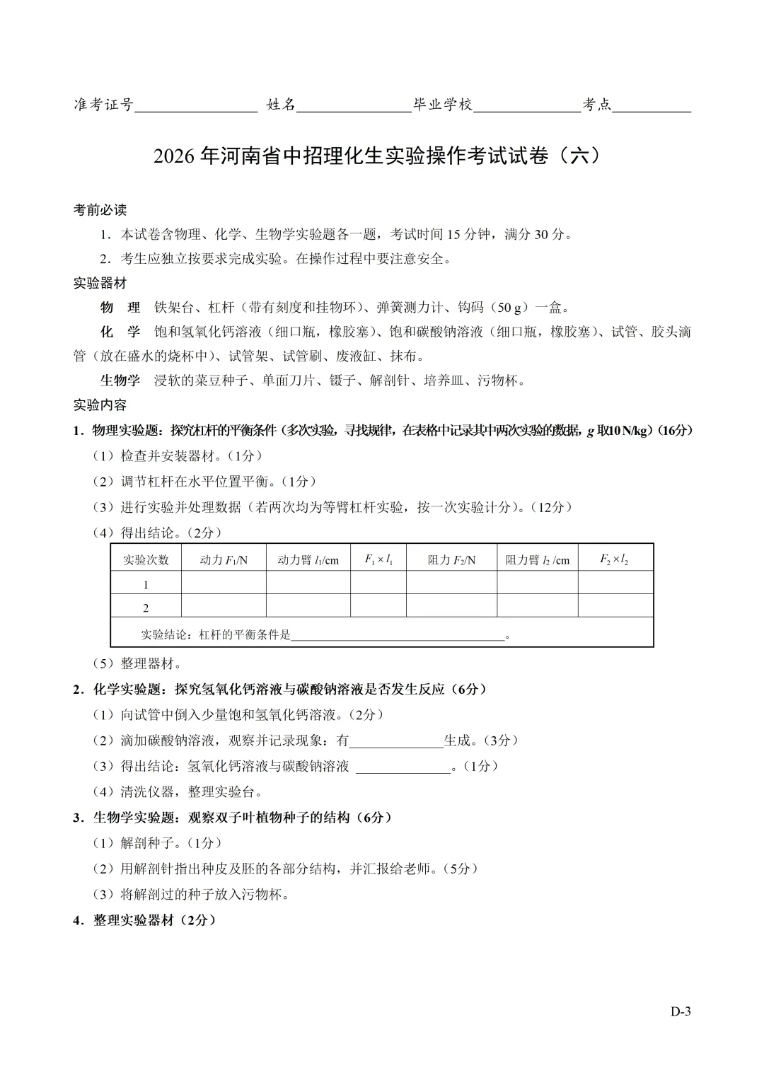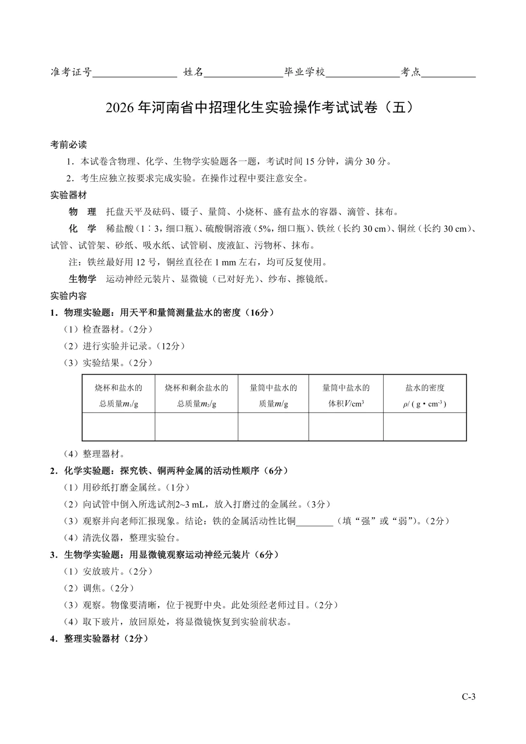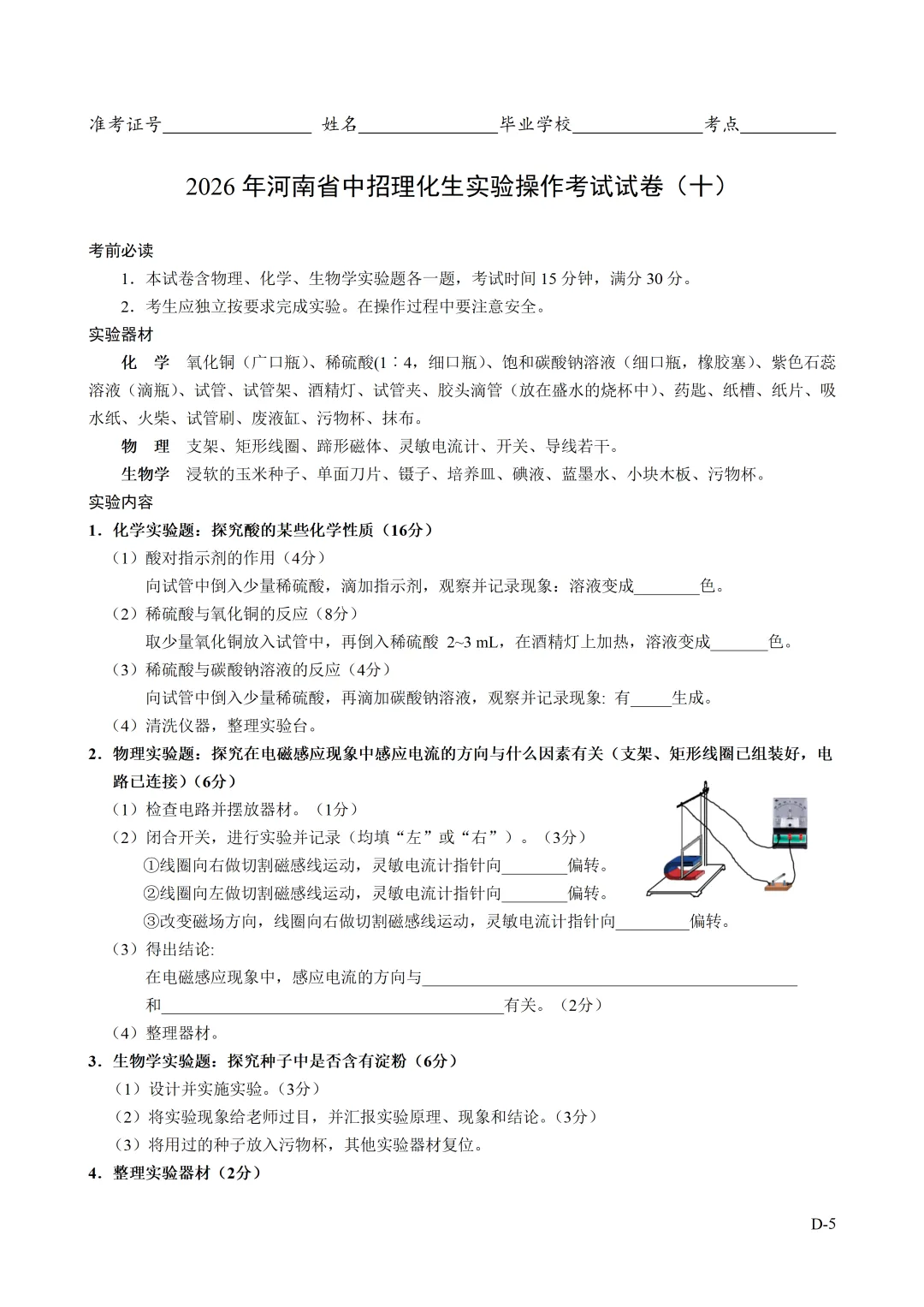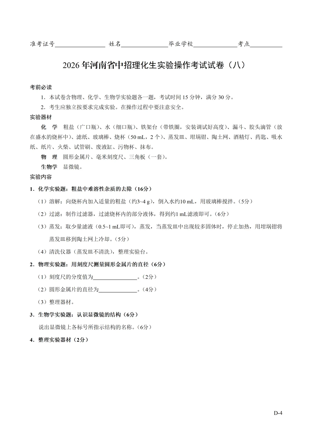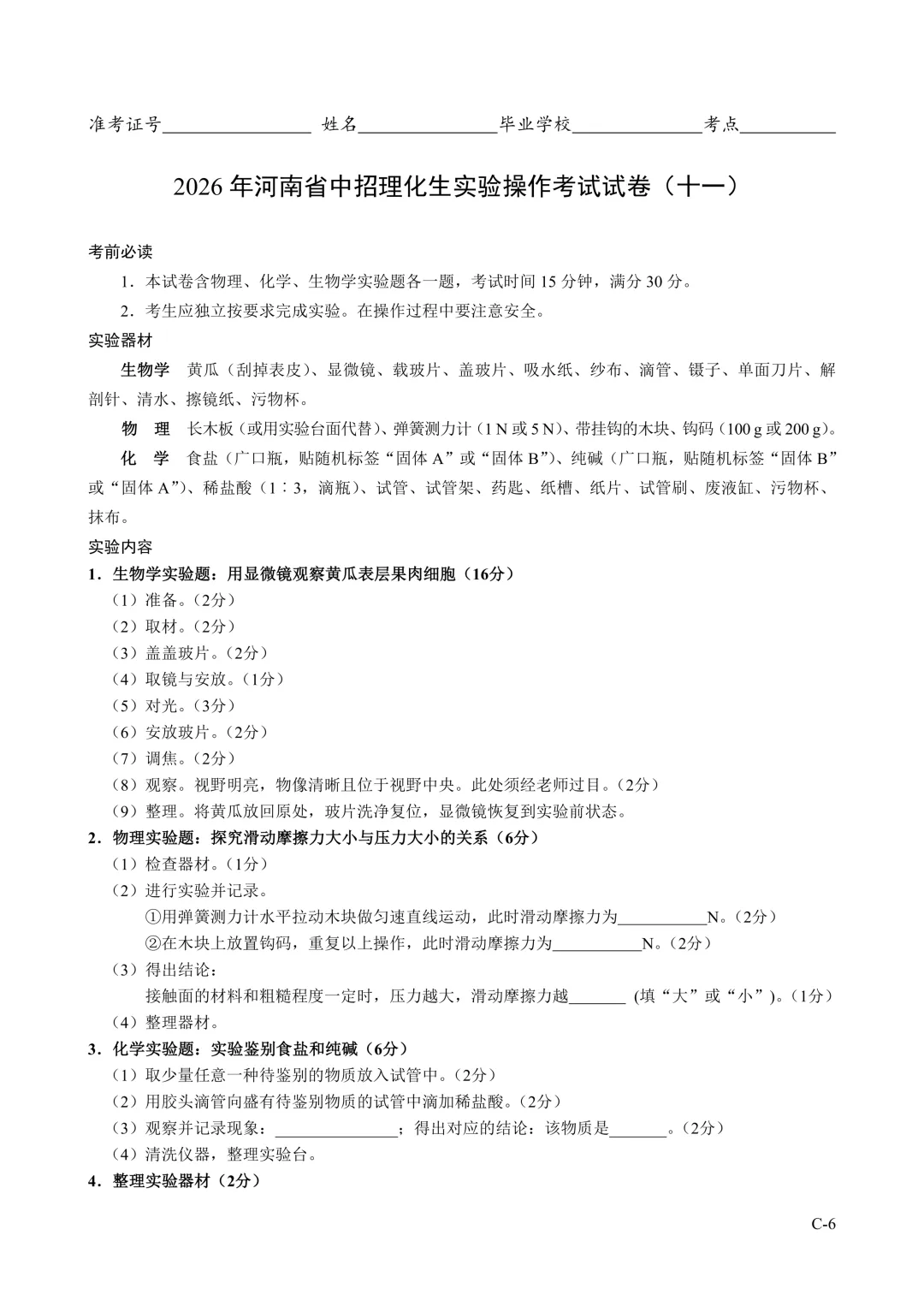 2026年河南省中招理化生实验操作考试试卷及评分表